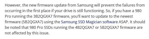 >>7475225 Про брак 870 evo, 980 pro и 990 pro писал как раз я, самсунг не один раз обсиралась за последнее время. Пользователи коупят что апдейты на прошивку исправляют проблему, но на форумах полно людей с отъебнувшими 990 про относительно недавно.