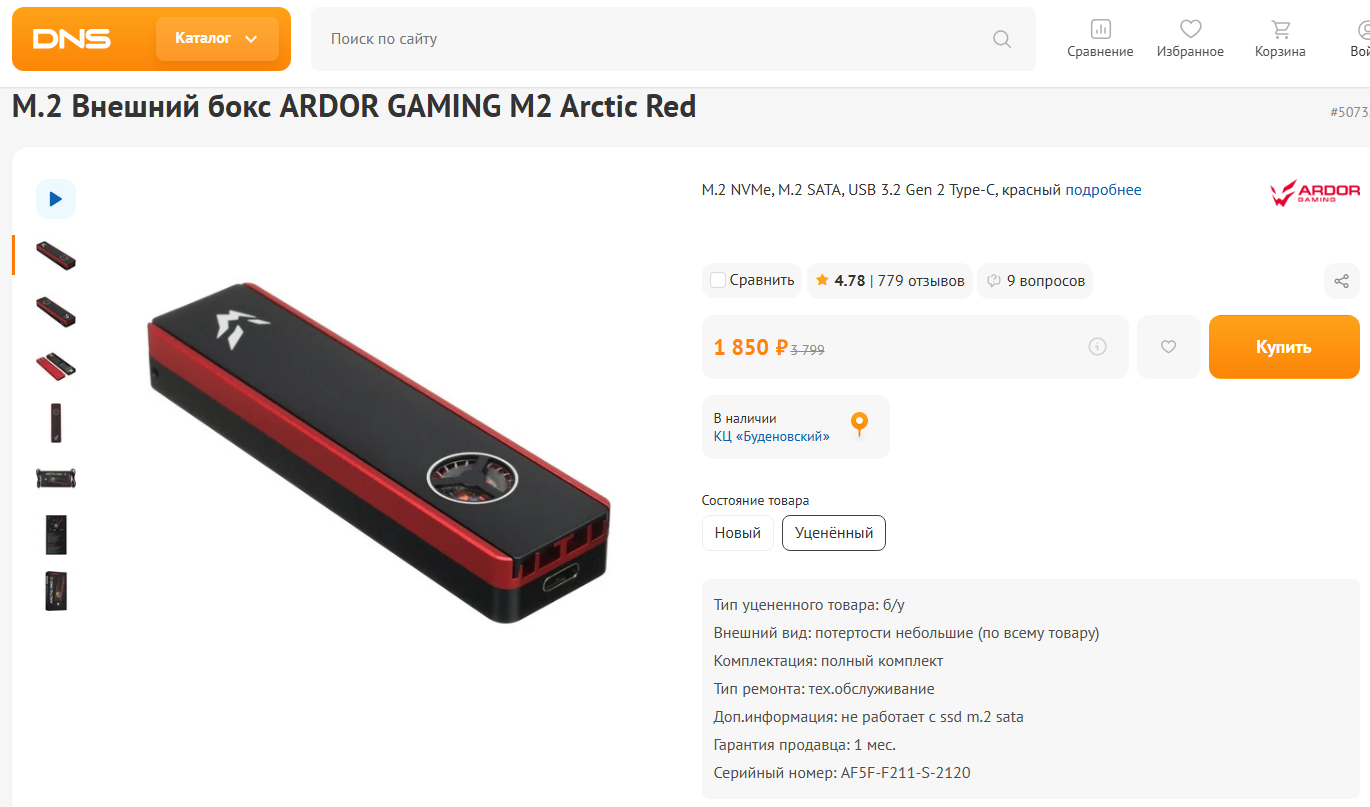 >>7460742 Переодически использую такой M.2 Внешний бокс ARDOR GAMING M2 Arctic Red . Нужно было срочно, не выбирал, купил из наличия в ДНС. Иногда записываю\считываю через него файлы, ок норм. Чтобы пропеллер охлаждал, надо совать термопрокладку внутрь. Я этого конечно же не делал. Если планируешь брать ссд с заводскими радиаторами, то наверное лучше посмотреть на другой адаптер.