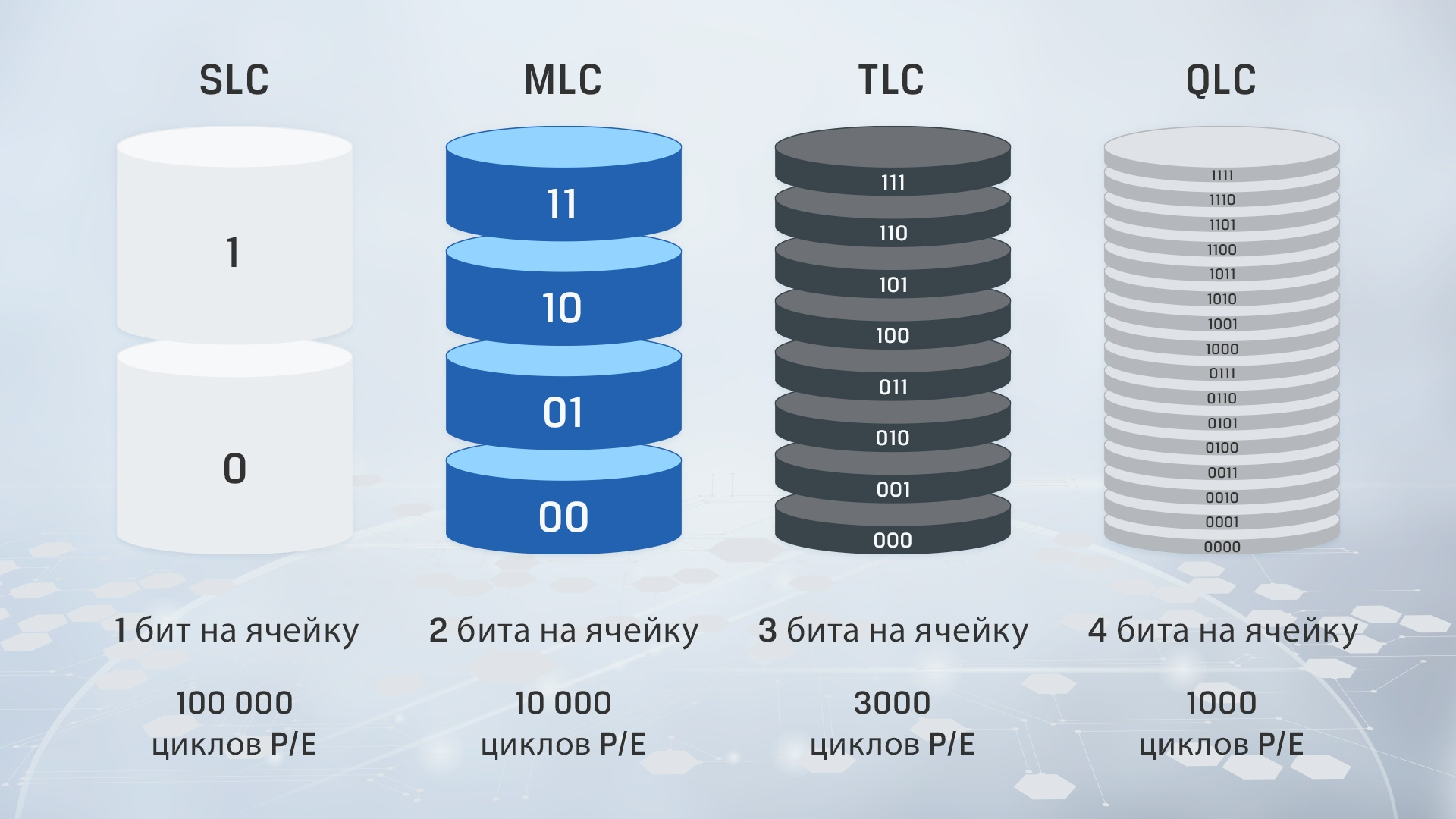1) Память по типу расположения ячеек делится на устаревшую планарную и современную трёхмерную (3D, вертикальную). Samsung вторую называет V-NAND, остальные производители как 3D NAND 2) SLC (Single-Level Cells), MLC (Multi-Level Cell), TLC (Triple-Level Cell), QLC (Quad-Level Cell) - это количество бит записываемых в одну ячейку памяти. 1, 2, 3 и 4, соответственно. Таким образом, например, 3D NAND TLC - это NAND память с вертикальным расположением ячеек и 3 битами информации в одной ячейке 3) Самая быстрая и надёжная память - SLC (уже не выпускается), 3D Xpoint (снята с производства) и MLC. Затем идёт TLC. QLC характеризуется низкой скоростью прямой записи в NAND и неважной работой с мелкими блоками 4) Внутренние SSD имеют следующие интерфейсы: SATA, mSATA, M.2 SATA, PCI-E, M.2 PCI-E. Ты должен знать, какие поддерживает твоя материка, чтоб не ошибиться с выбором. Изучай спеки на сайте производителя. Если М.2 разъём поддерживает только SATA интерфейс, PCI-E SSD в нём работать не будет. Наиболее производительными являются устройства на шине PCI-E x4 (NVMe) 5) M.2 SATA и M.2 PCI-E x2 устройства имеют ключи B+M, M.2 PCI-E x4 - только ключ M 6) SATA диски могут иметь или не иметь DRAM-буфер. Он нужен для оптимизации взаимодействия контроллера с NAND-памятью — в ней хранится и редактируется таблица трансляций адресов NAND. При отсутствии DRAM, таблица адресов хранится непосредственно в NAND-памяти, что приводит к существенному снижению скорости операций контроллера с ней. PCI-E накопители могут иметь DRAM, а могут использовать в качестве него небольшой (до 64 MБ) объём системной оперативной памяти (технология Host Memory Buffer — HMB). Поддержка HMB в ОС началась с Win10 (1709). К тому же, безбуферные/HMB контроллеры, как правило, обладают меньшей вычислительной мощностью и меньшим количеством каналов/подканалов обращения к NAND. Для установки системы предпочтительны устройства с DRAM 7) Инфу о железе без снятия радиатора и наклейки можно получить с помощью утилит от Вадима Очкина http://vlo.name:3000/ssdtool/ (для чего нужно знать модель контроллера) или в обновляемой таблице https://docs.google.com/spreadsheets/d/1B27_j9NDPU3cNlj2HKcrfpJKHkOf-Oi1DbuuQva2gT4/edit#gid=0 8) Наличие/отсутствие DRAM на диске можно определить по модели используемого контроллера или по фото платы (микросхема DRAM на ней хорошо видна). Характеристики контроллеров смотри здесь: https://andiriney.ru/kontrollery-ssd/ 9) Не стоит путать DRAM-буфер и SLC (Single-Level Cells)-кэш. Последний есть у всех устройств с TLC и QLC памятью. Представляет собой временную запись данных на выделенную часть NAND-памяти в самом скоростном однобитовом режиме (1 бит в ячейку) для последующей медленной перезаписи 3-х (TLC) или 4-х (QLC) бит в ячейку. Именно SLC-кэш позволяет достигать огромных скоростей. Тогда как запись непосредственно в TLC и QLC в разы, а то и десятки раз ниже - её ты можешь увидеть после исчерпания кэша. Размер SLC-кэша может быть разный, включая динамически изменяемый с различными алгоритмами, тут без чтения обзоров на «железных» ресурсах не обойтись 10) M.2 PCI-E диски можно установить в PCI-E x16 слот через переходник, однако старые материнские платы могут не поддерживать загрузку с PCI-E (NVMe) дисков. Если не уверен, лучше спроси тут или в «Ньюфаг-треде» перед покупкой