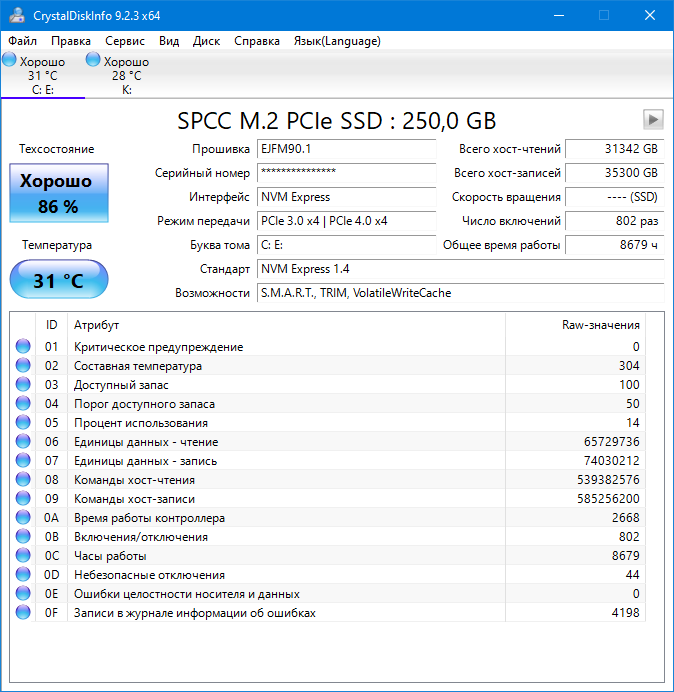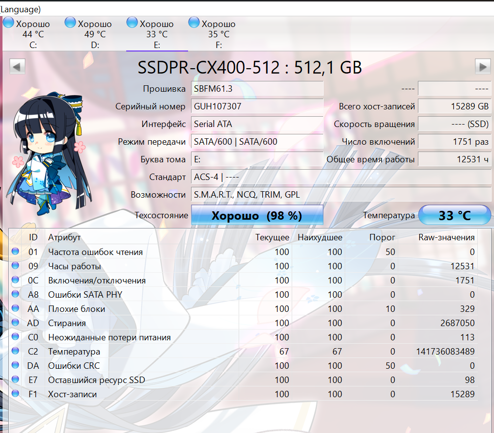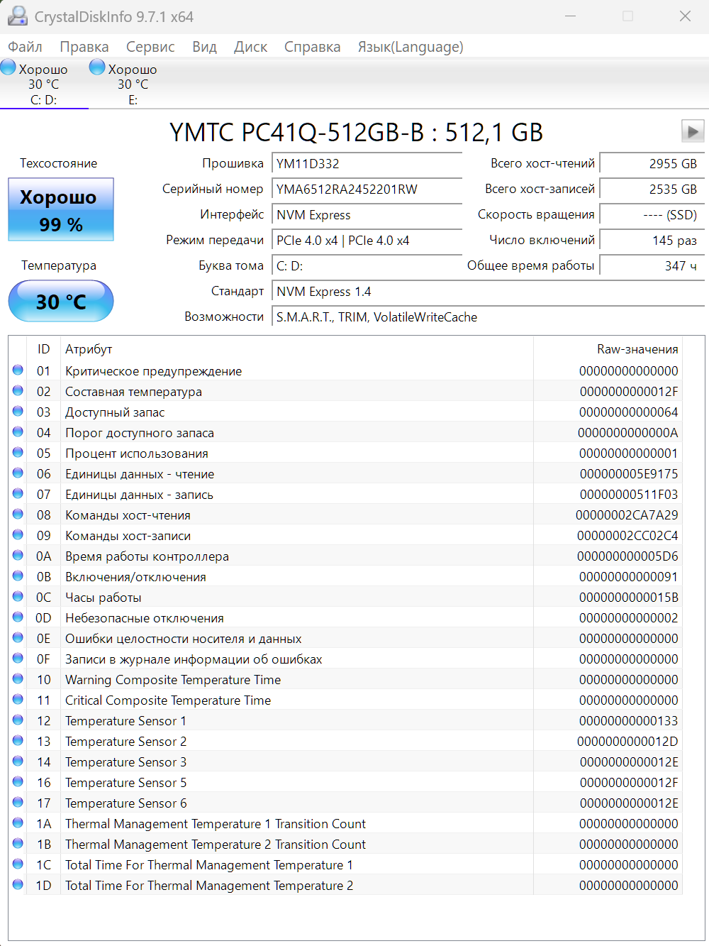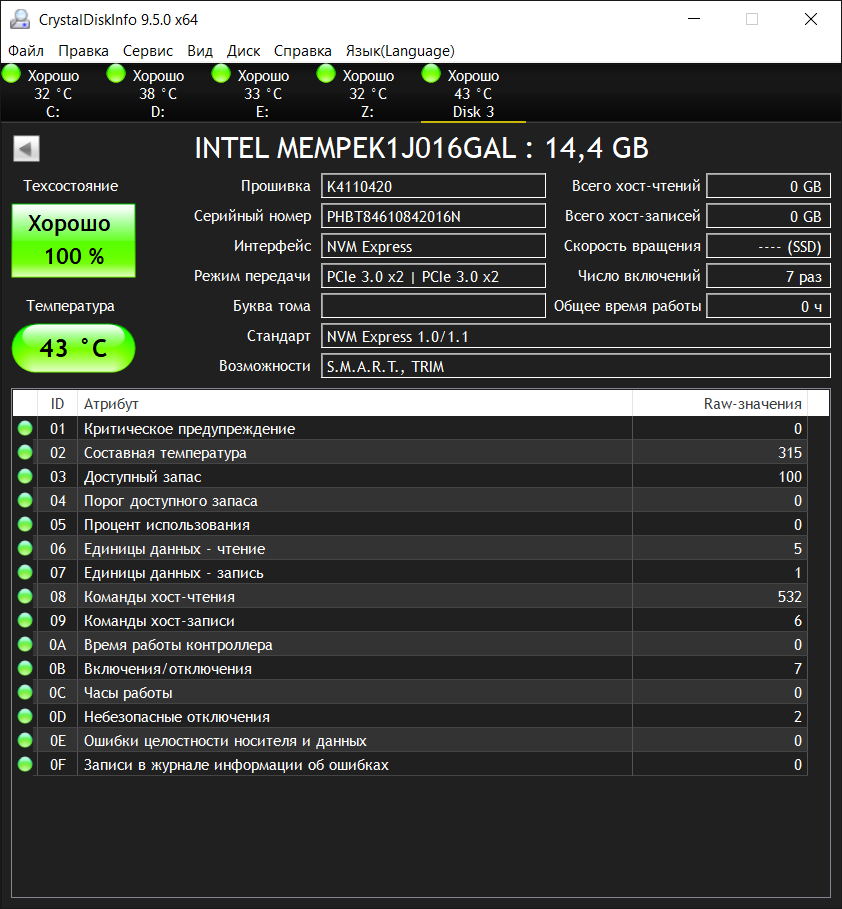 При вопросах о состоянии ссд по смарту переключай программу Crystal DiskINFO в десятичный режим! (ОП-пик №2)