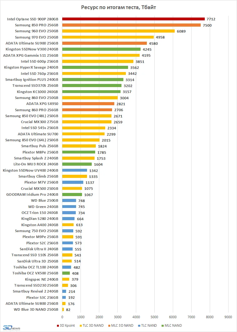 Середняк: • Kingston KC600 (Micron TLC, DRAM, контроллер SM2259) • ADATA SU800 (Samsung TLC, DRAM, контроллер SM2258) • Transcend SSD230s (Micron/SanDisk/Samsung TLC, DRAM, контроллер SM2258) • Plextor M8VC Plus (Kioxia TLC, DRAM, контроллер SM2258) • WD Blue / SanDisk Ultra (SanDisk TLC, DRAM, контроллер Marvell 88SS1074) • WD Red SA500 (SanDisk TLC, DRAM, контроллер Marvell 88SS1074, рекомендован для NAS, упор сделан на прямую запись в NAND с минимальным усилением)