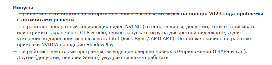 >>7490331 Потому что там нет миллиарда прослоек, это тривиальное мгновенное копирование во фреймбуфер выводящей карты, все типаигровые ноутбуки так и работают постоянно и вроде никто не жаловался, кроме того, патченые драйверы не проходят проверку античитов, так что на соревновательные игры никто не рассчитывает.