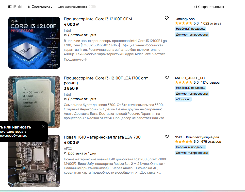 И этой красной линией будут две сборки: 1. 10400ф 4-5к, материнка лга1200 2-3к, память 1-1.5к, и видеокартой по верхней грани ртх3070 20-23к Цена в 9.5к за комплект с авито в режиме "максимально сейфово", будет хорошим выбором для обычного человека, желающего просто сэкономить, при этом не становясь "бомжом". А от 7 до 9к начинаются компромиссы с мониторингом авито, социальным инжинирингом, покупкой сомнительных вариантов(оем говна) и мутных продавцов. 2. 12100f, авито, проц 3к + мать 3.5-4к + память 1-1.5к итого ~8к. С той же логикой, что и у 10400ф, но платформа с большим уклоном в синглкор.
