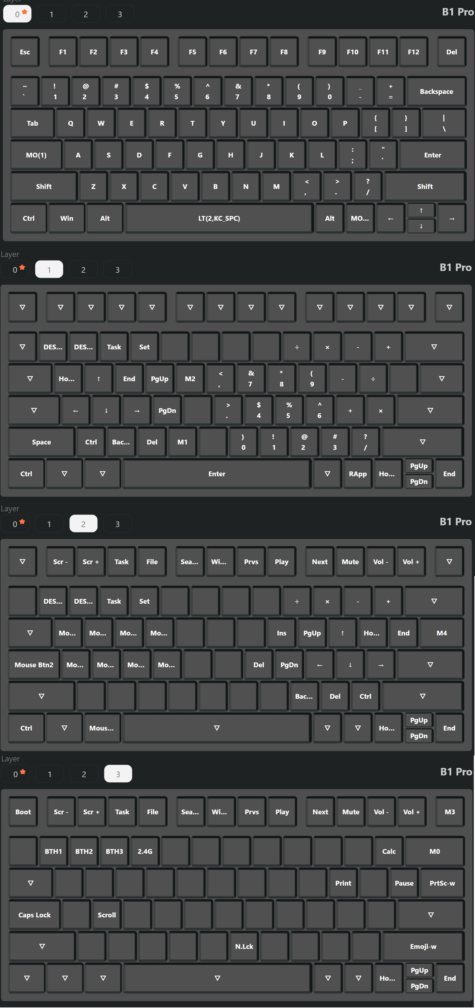Недавно купил для в качестве носимой программируемую мембранно-ножничную Keychron B1 и понял, что ультра-низкие клавиатуры, если бы там были хорошие свичи и возможность программировать слои с помощью QMK или ZMK — удобные для рук штуки, не требующие подставки для запястий. Погуглив как следует я не нашёл готовых клавиатур, которые бы обязательно были: 1. Плоские как пик рилейтед (черри ulp, кейхрон b1). Скульптирование рядов и кепок возможно, но чтобы профиль оставался супер-низким. Lofree Flow и прочие в этом плане слишком высокие. 2. С механическими свичами, неважно какого типа, но чтобы свичи и кепки можно было заменить, ну или если это электро-ёмкостная, хотя бы можно было заменить кепки, с ходом хотя бы 2мм. 2. Программируемые, со слоями, с помощью QMK, ZMK или любого иного вендорского софта. (на третьей пикче раскладка моих слоев). Они вообще существуют? Черри ulp хрен где купишь, да и то за баснословную сумму, и не программируются. Всякие низкопрофильные на деле высоковаты.