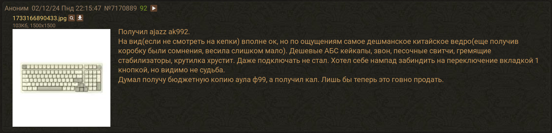 >>7507157 Да, он тебе, мнительному творожку, весьма дельное предложение делает — рассказать про свой опыт и на твой взгляд топовые клавиатуры с его высоты.