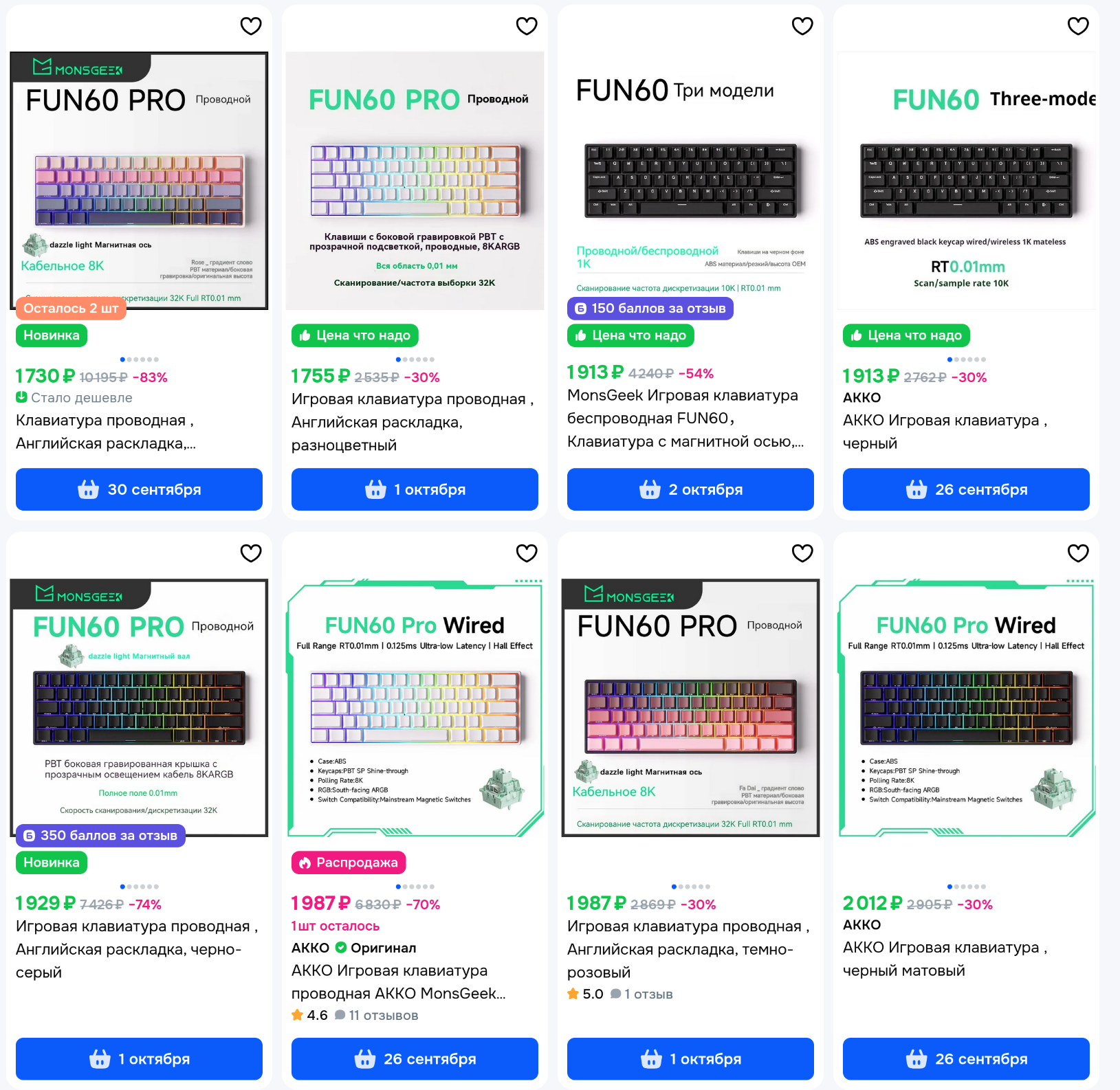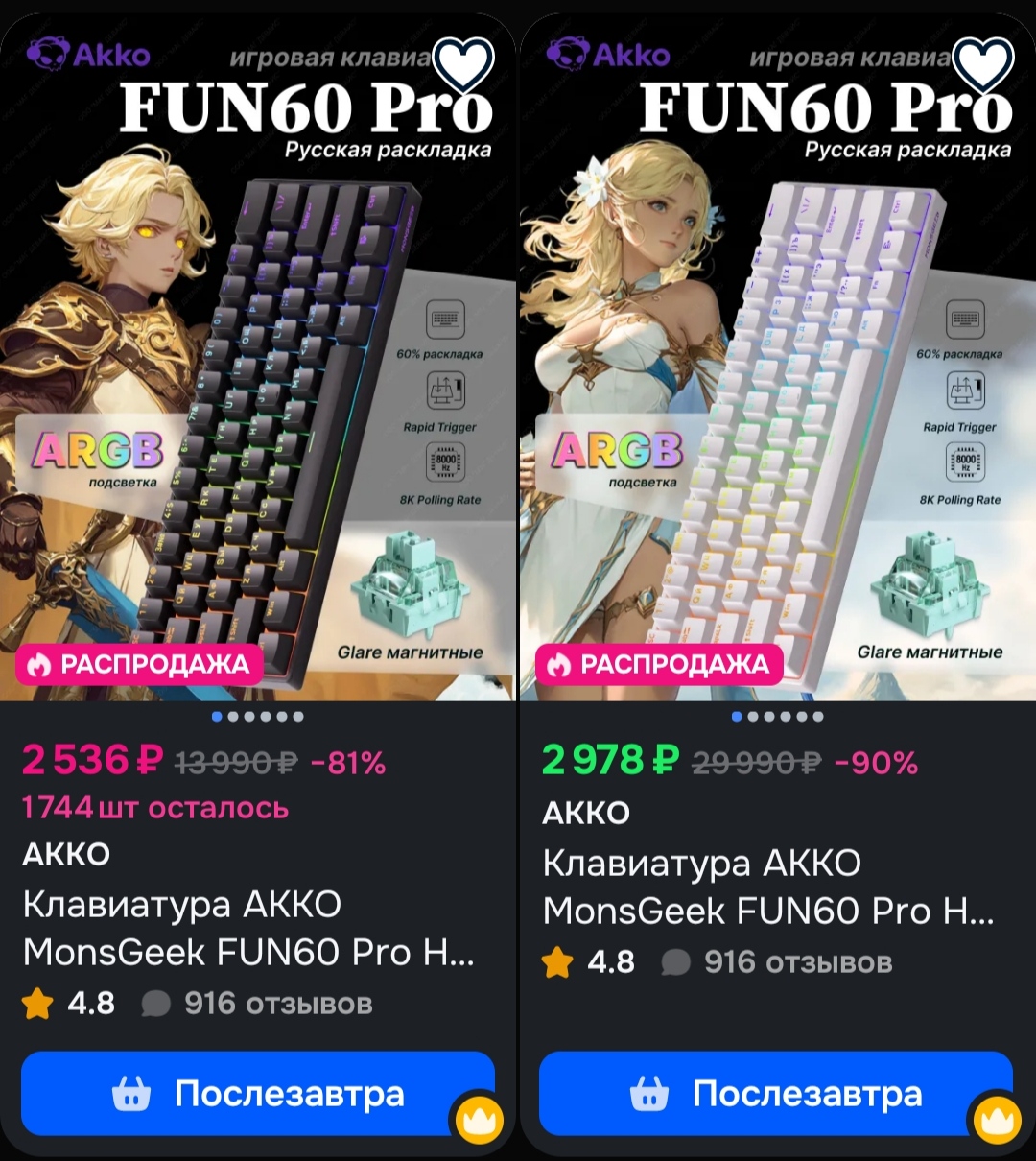Топ магнитка. Вообще охуевшая. Цена ей 8-9к где то, но на озоне с какого то хуя уже аж по 2,5 толкают. Видать 60% нахуй никому не нужно и сливают кал. Ну я себе белую покупал месяца 3 назад, не зашло, и проводом, магнитами (не мое) и 60% (тоже не мое), валяется теперь в шкафу. Но сама по себе клава просто имба во всем, пластик мое почтение, тяжёлая, проигрался с свичами через софт, прикольно.. Кому надо магнитку 60% для игрулек то это самое то сейчас.