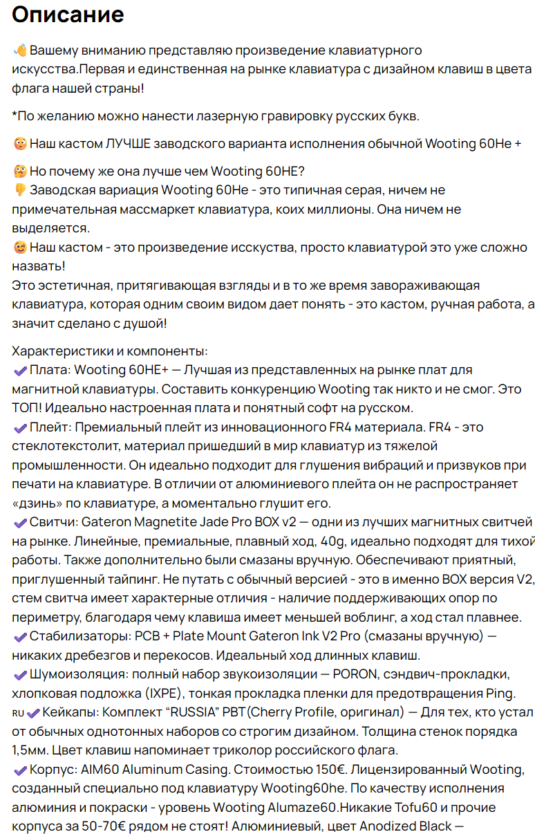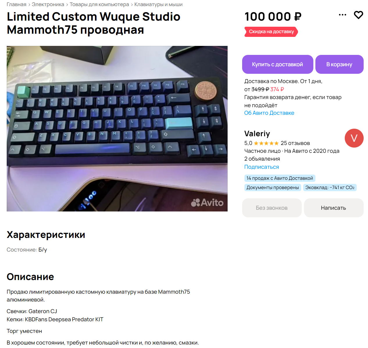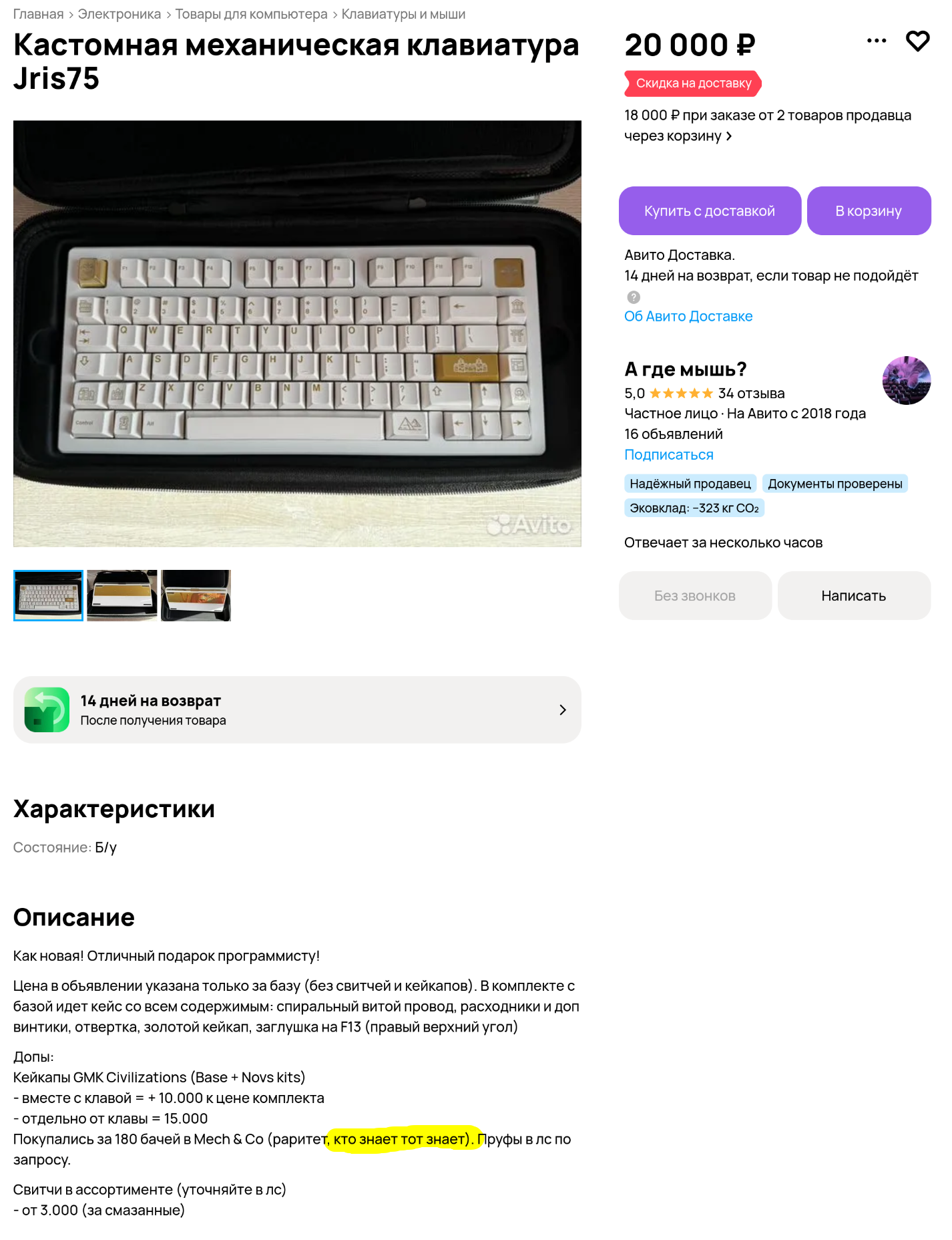 Нужно покупать дешманскую базу (QMK87, уже почти 4к) Сычи тихие (Silent Peach V3 90 шт.) (+1300р, суммарно уже ~5300) Кепки дешмань но не из говна (там уж какие выберешь, но тоже +1.5-2к) И того получается 7300