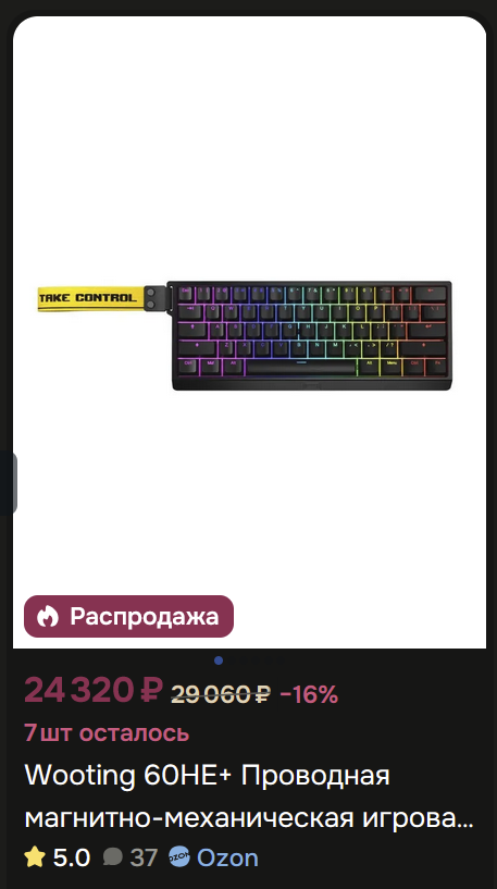 >Ну т.е. давай цену разделим на: >А) Сколько ты готов отдать за свитчи и кейкапы >Б) Все остальное >Сколько ты готов отдать за А и за Б? Я хотел ZSA Moonlander, но это для меня как-то дорого, ведь вещь специфическая и не подойти. Я всегда смотрел на клавиатуры, как на что-то цельное. Но видимо действительно нужно разделять свитчи, кейкапы и остальное. Тогда, если считаь, что свитчи с кейкапами могут кочевать с клавиатуры на клавиатуру, то я могу отдать за них в принципе любые деньги. За остальное в пробной сплит клавиатуре я бы не хотел отдавать больше 10к. Хотя по-моему это уже космические деньги за клавиатуру.