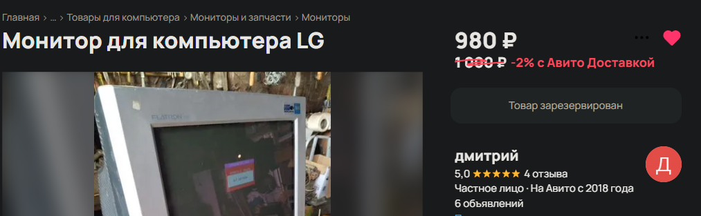 >>7551728 У меня схожая проблема, тоже ищу себе 19-21". В моём мини-городе на 600к вообще на авито ничего нет, только 17" за 500р и то изредка всплывает. С доставкой бы взял даже в пределах 3к по цене, не так жалко, но хуй там из-за веса, они ж от 20кг будут, такое не доставляет никто. Ниипу что делать, тупо ежедневно мониторю авито уже второй месяц, безрезультатно