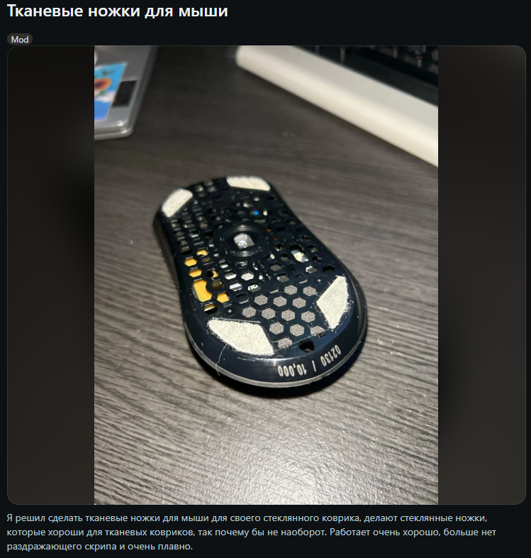Есть какие нибудь специальные глайды для юзания мыши без ковра? Тканевые глайды может? Юзаю пикрил насадки на стулья из войлока чтобы не коцать паркет, уже лет 5, неубиваемые, и стулья скользят хорошо, прям кайф. Мышью же шеркаю по столешке из массива, жалко, но коврики не люблю, пробовал всякие, и дорогущие, без них кайфовее, нравится ощущать дерево.