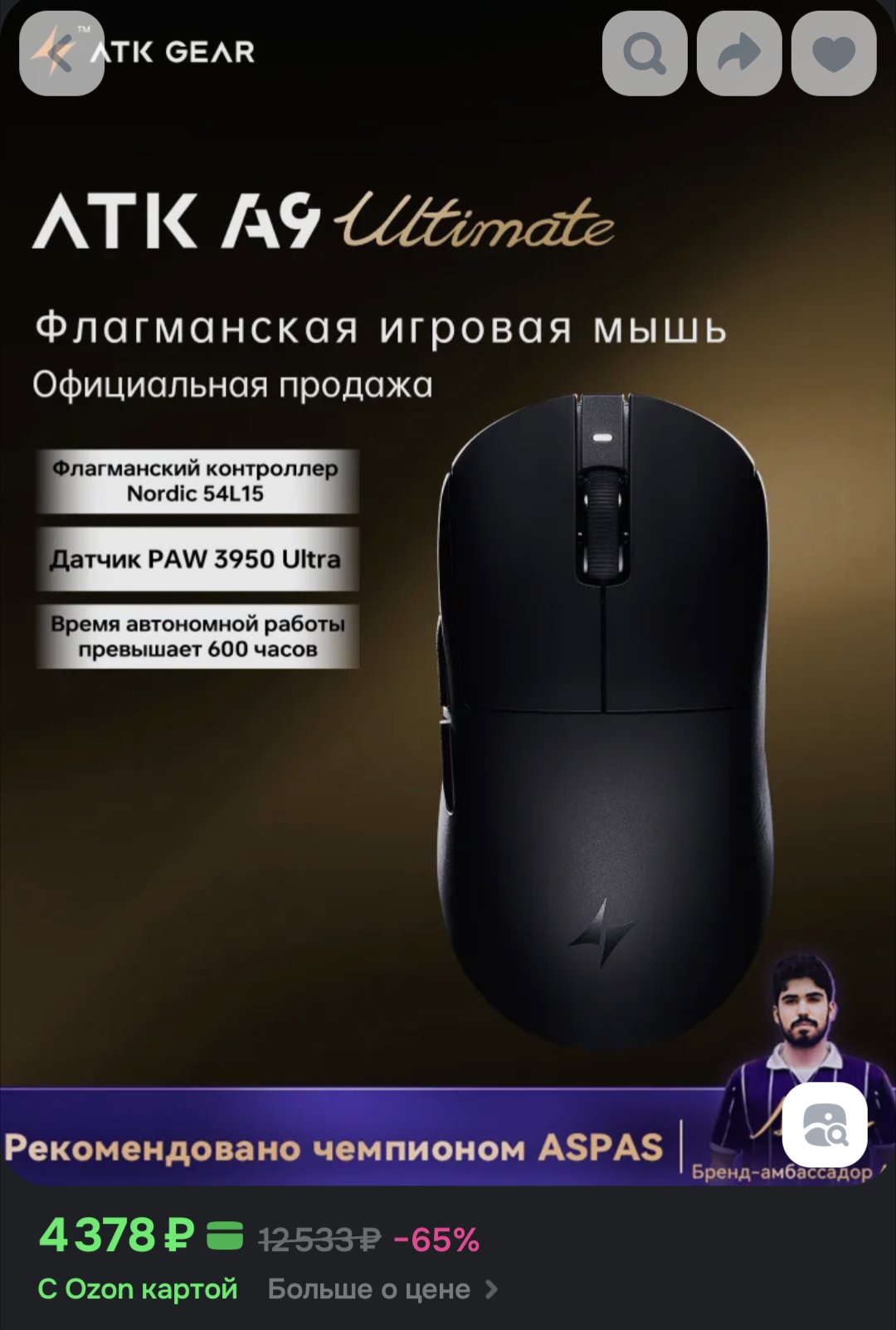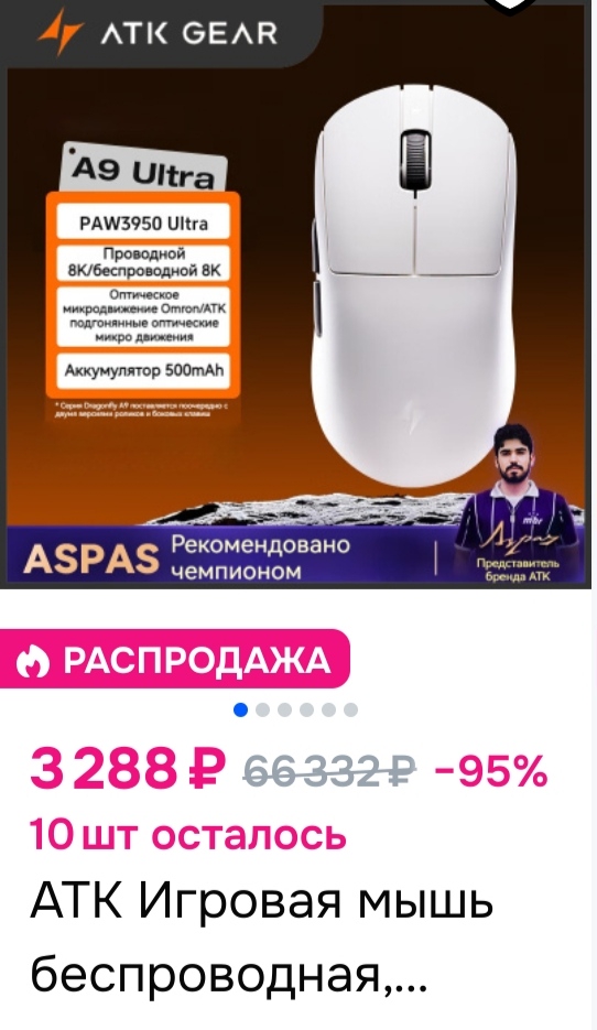 Суперлайт по сравнению с ней ебаный кирпич, она очень легкая, 38 граммов с глайдами. Понятно, что она еще и меньше, но все равно разница большая. Форма пойдет, смог найти комфортный хват. Сборка хорошая, ничего не скрипит, не прогибается. Однако, в плане сборки гпх все равно лучше ощущается, но он и не весит 38г. Короче, не могу сказать что отдает какой-то китайской хуйней, хороший продукт. Далее, стоковые глайды охуенные, больше нравятся, чем тайгер айсы, менее липкими ощущаются. На клики мне похуй, боковые пойдут, скролл дефолтный, но лучше, чем у супелайта. Вообще все эндкодеры хуйня жидкая, только у зови нравятся с четким ходом. ПО нормальное, есть веб версия, что несомненно плюс. Покрытие дефолтное, ничего не могу про него сказать. Теперь к минусам, он тут один - это заряд. Вообще нихуя не держит, максимум на пару дней хватает на 1к гц. Еще есть настройка пик 2, возможно она влияет, включаю 2 или 3 режим в играх. Перевожу - Частота дискретизации датчика - Основной режим/Конкурентная прошивка ATK Shark/ATK Fierce Shark Competitive Firmware MAX (В этом режиме производительность датчика достигнет своего предела, частота кадров статического сканирования ≥ 20000, задержка. Дальнейшее сокращение, более точная траектория движения). Суперлайт я раза 2 в месяц заряжаю, обычно даже не помню, когда в последний раз на зарядку ставил. В случае с атк это терпимо за такую цену.