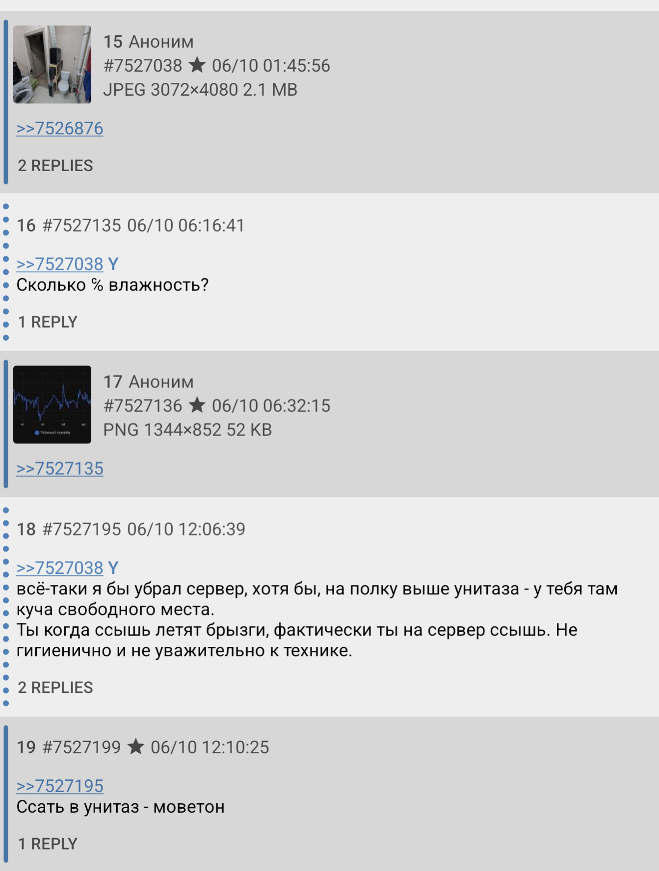 >>7527038 всё-таки я бы убрал сервер, хотя бы, на полку выше унитаза - у тебя там куча свободного места. Ты когда ссышь летят брызги, фактически ты на сервер ссышь. Не гигиенично и не уважительно к технике.