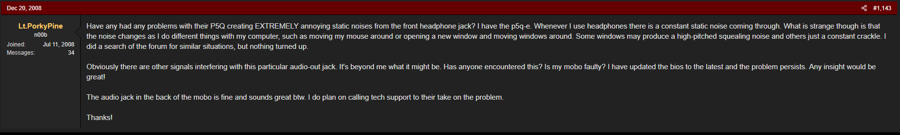 цепанул наушники на 775 послушать хоть сперму в 2025 году, а там капец наводки на 3.5 передней панели, как будто модем фоном подключают. вот и думай нахуй, это корпус косячный (но он новый) или это говно от старости протухло\такое уже было. а может бп говно. а может видюха. с гнезда сзади норм.