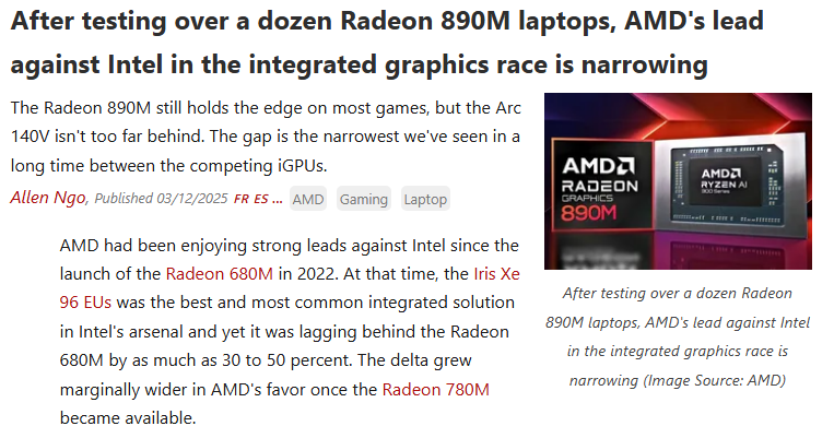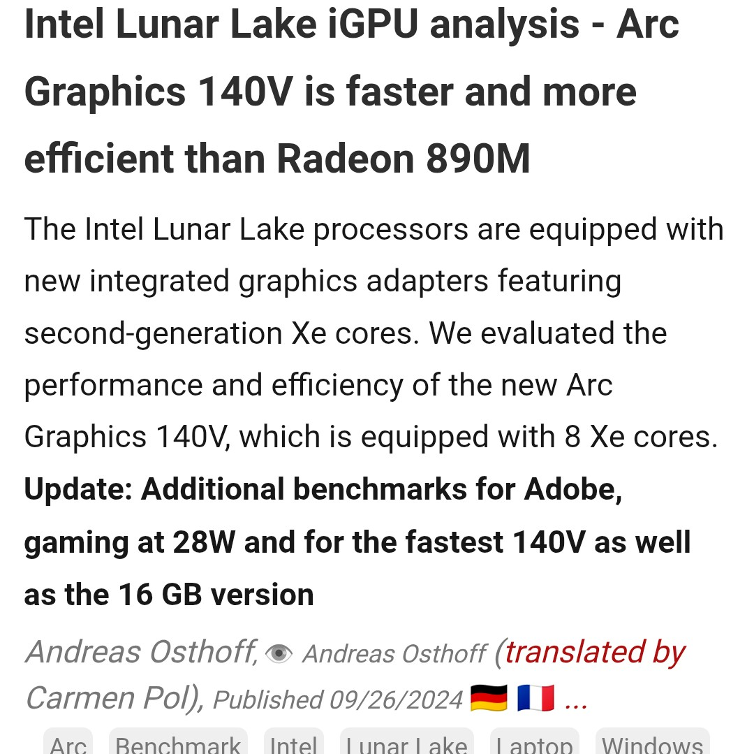 >>7533483 А никто не сравнивал 780M и 140V, протри глаза. >Arc Graphics 140V is faster and more efficient than Radeon 890M Это стекломойные амудыньки сравнивают 780M и 5+летнюю Xe))0