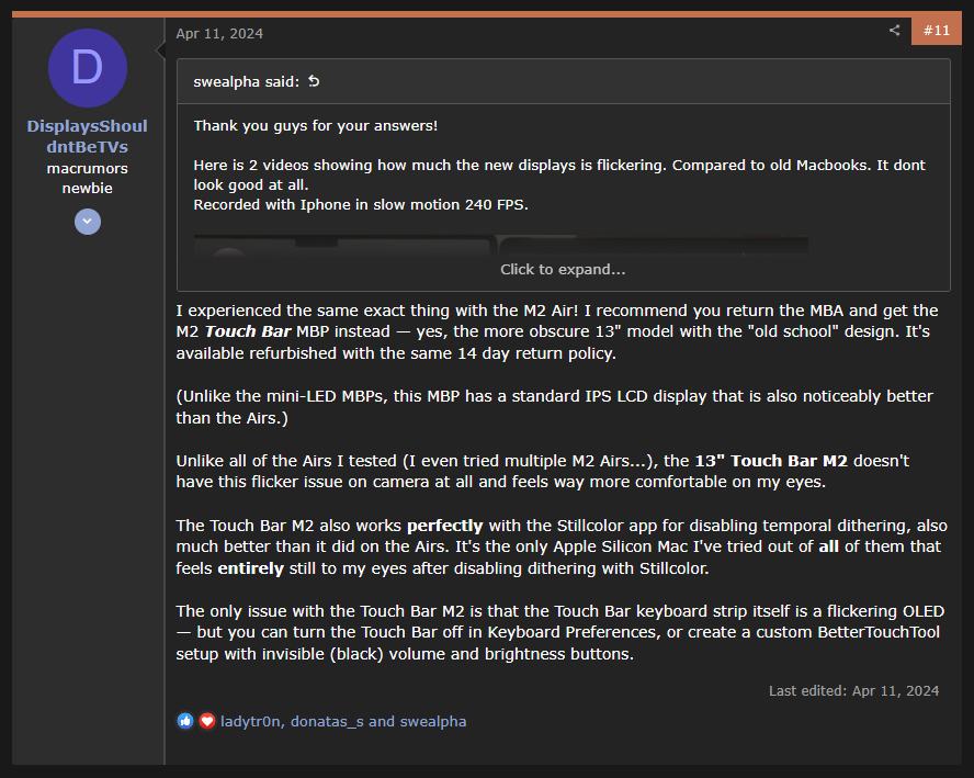 >>7534677 >>7534679 >>7534681 Вот этот юзер, в т.ч. на ledstrain, советует Pro 13 M2. Полагаю, дело не только в ШИМ, но и в дизеринге. TB можно погасить.
