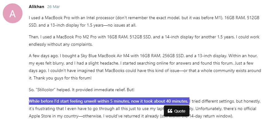 >>7534693 >>7534698 Покапчевал сегодня с Air 15 M2 пару часов. Глаза устают меньше, но все равно чувствуется напряженность в районе переносицы. Если бы я точно знал, что такого эффекта не будет на Pro 13 M2...