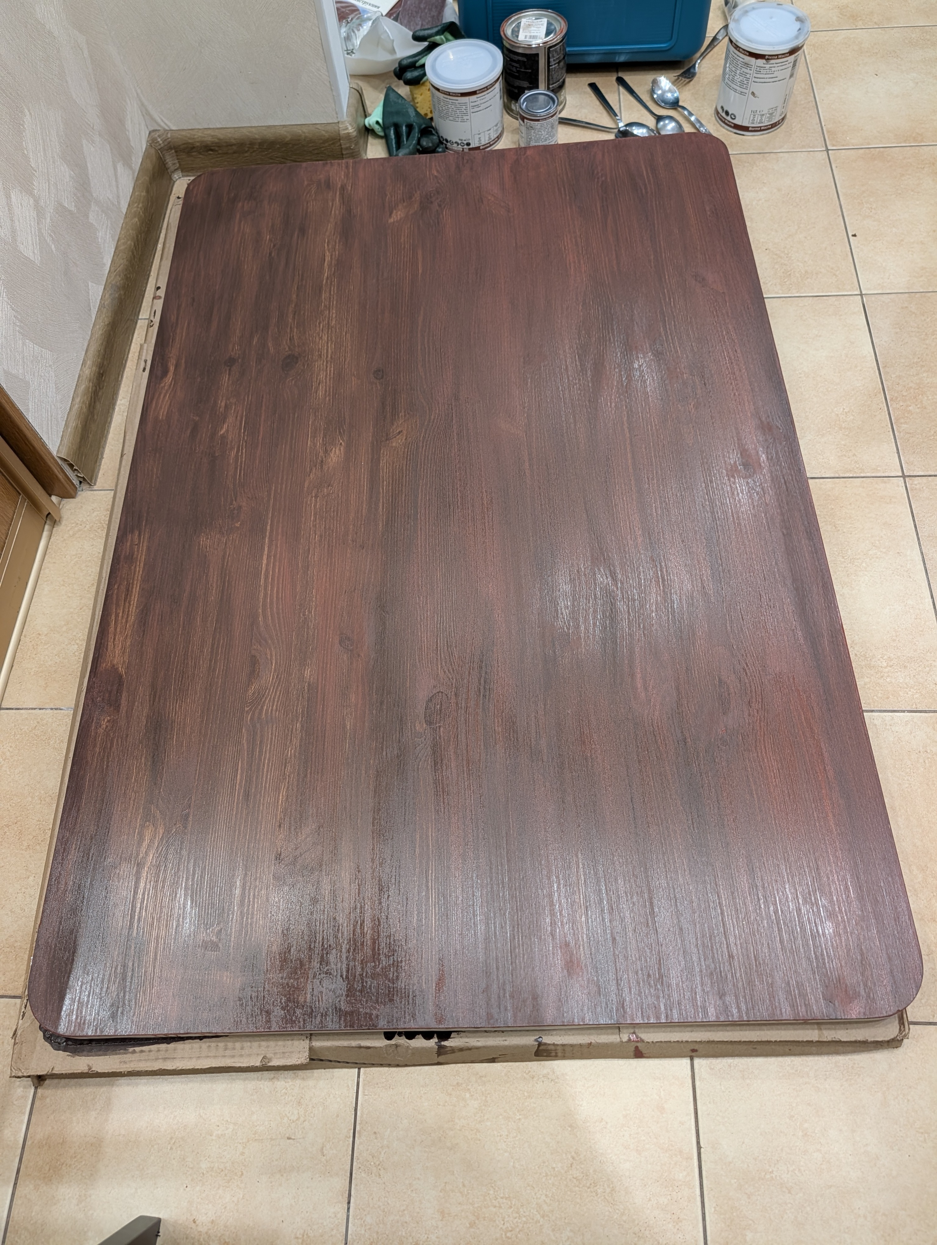 >>7537927 >>7537929 хуйнёй какой-то страдаешь, возьми морилку тёмную и крась в три слоя, потом лак. только с лаком надо уметь не обосраться, у меня он так и остался на стеллаже липкий