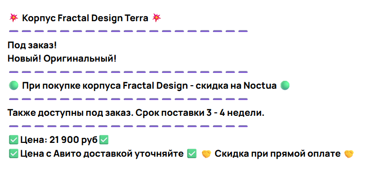 У Авито платное и очень дорогое продвижение (некоторые мои коллеги, например, сливают туда до миллиона в месяц, и это не какие-то известные бизнесы, а просто мелкие никому неизвестные предприниматели с микробизнесами, в любом случае, нормальный бюджет в нашей нише для крупных городов от 100к в месяц на одно обьявление, а у многих по 200-300 обьявлений для пользователей с разной моделью поведения и разных регионов). Ты же мой хомячок наверное думаешь, что там (особенно топы) такие сирые и убогие сидят, поэтому у них все так криво оформлено. Авито - это очень тонкий баланс между недоверием хомячков к образованным профессионалам, то есть бизнесу, и конечно же недоверием хомячков к некачественным продуктам.