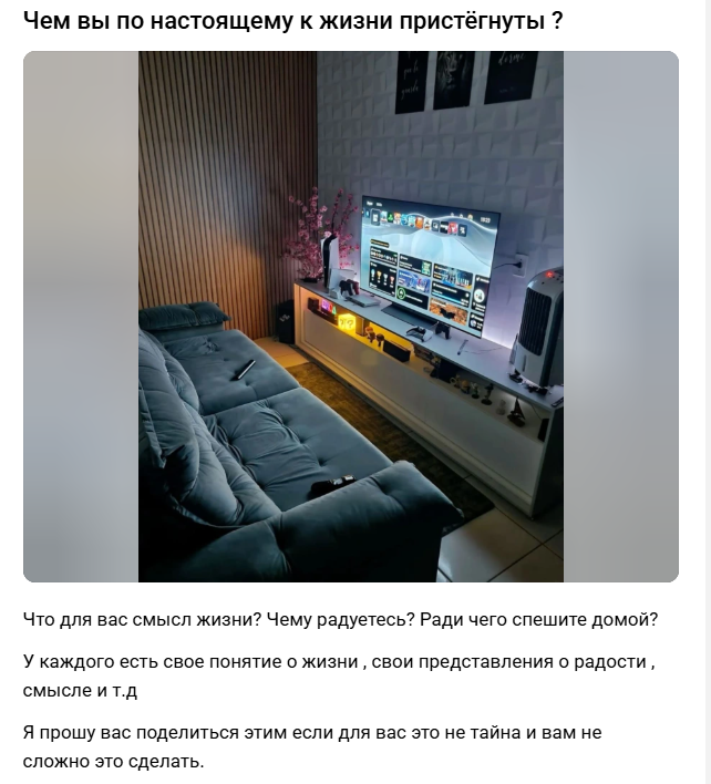 >>7536741 Какие владения? Загаженную комнату 10 квадратов с мебелью из хоффа? В углу мордой в стену сидят, потому что это самый экономный с точки зрения занимаего места сетап. Вот и всё.