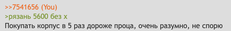 >>7542443 >Ниже - хорошо если процентов на 30 получится. Может на 50 даже. >Да какие 20, боже. Оно и пяти баксов в большой серии не стоит. Ясно, математика не твоя сильная сторона. Вот сидят китайцы на корпусостроительной фабрике, делают для клятых буржуев корпуса за 5, ты приходишь, и говоришь, даю 20 за то же самое, да они детей будут в твою честь называть, за такую щедрость, дальше продаешь без рекламы и маркетинга, это нишевый продукт для энтузиастов, тут достаточно поста на профильном форуме, купят просто из любопытства а если продукт хороший то довольные клиенты и рекламу сделают бесплатную. >Да и никто не купит на Авито реплику твоего Фрактала процентов на 30-50 дешевле За полцены купят, если он будет такого же качества или лучше, но почему только на 50? мы же выяснили что себестоимость 5 баксов, а остальное ПЕРЕПЛАТА и МАРКЕТИНХ >Только это бесполезно. Тщетно бытие