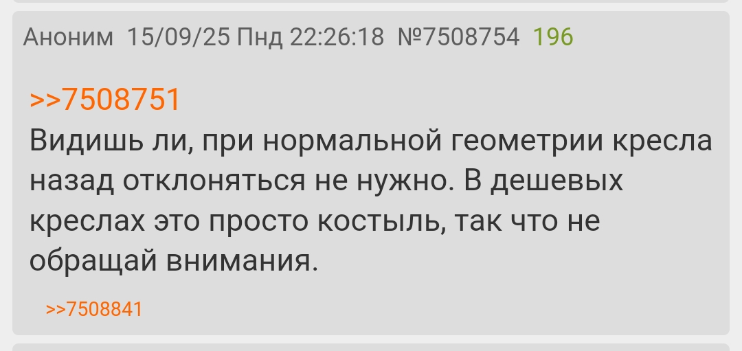Самое смешное в том, что если чел купил хорошее кресло, то он не будет несколько лет 24/7 бегать по форумам выбора кресел и всем рассказывать, что у него абсолютно идельное кресло, которое его всем устраивает. Он просто забудет про эту тему навсегда и будет заниматься спокойно другими делами.