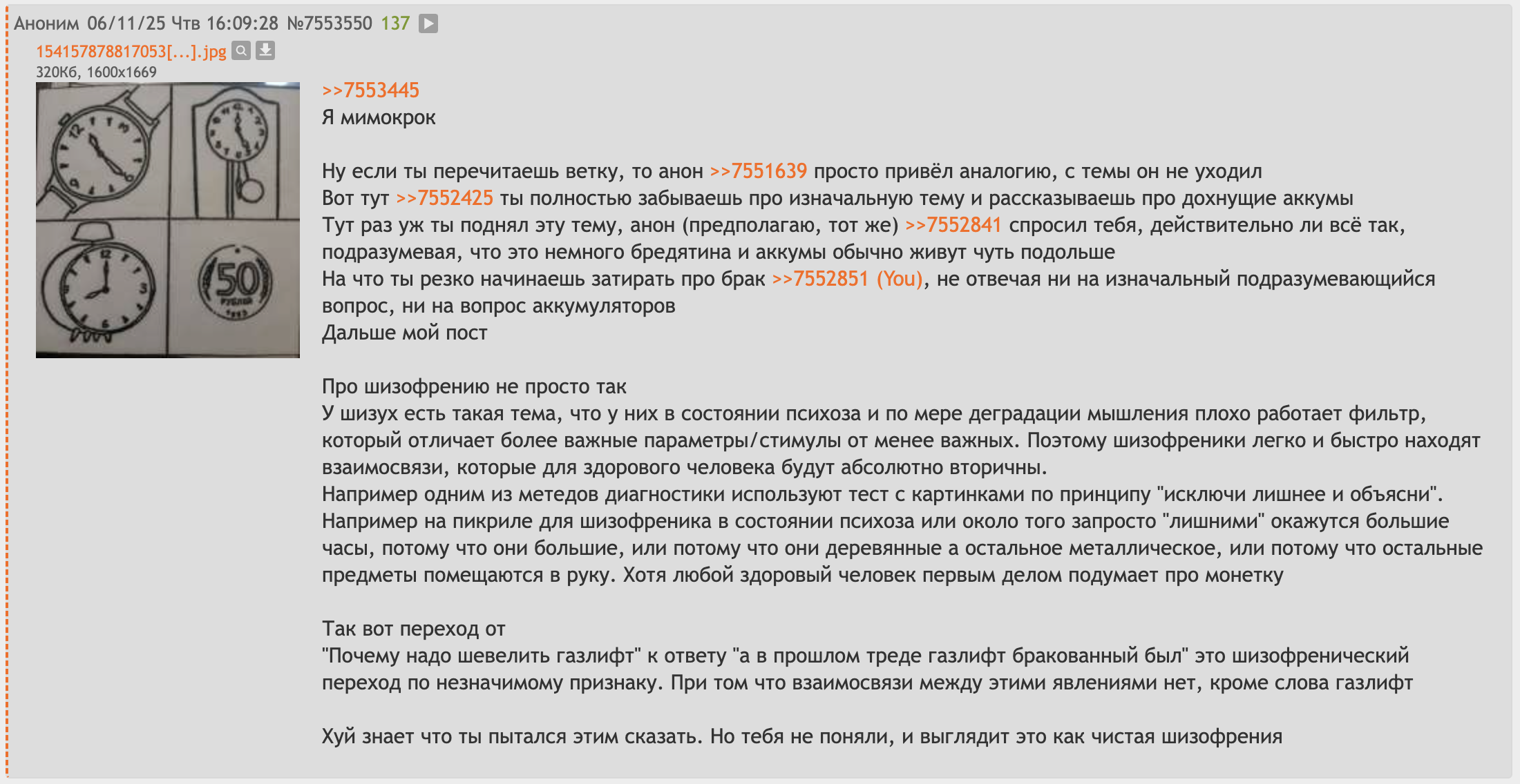 Про шизофрению не просто так У шизух есть такая тема, что у них в состоянии психоза и по мере деградации мышления плохо работает фильтр, который отличает более важные параметры/стимулы от менее важных. Поэтому шизофреники легко и быстро находят взаимосвязи, которые для здорового человека будут абсолютно вторичны. Например одним из метедов диагностики используют тест с картинками по принципу "исключи лишнее и объясни". Например на пикриле для шизофреника в состоянии психоза или около того запросто "лишними" окажутся большие часы, потому что они большие, или потому что они деревянные а остальное металлическое, или потому что остальные предметы помещаются в руку. Хотя любой здоровый человек первым делом подумает про монетку