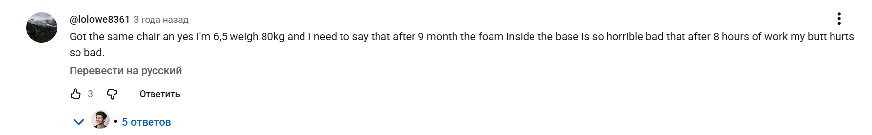 На моем опыте негативные ревью кресел всегда совпадали с реальностью, а вот позитивные наоборот. Даже по логике никто не станет заказывать антирекламу какому то стулу ведь их миллион на рынке, разоришься, проще заказать рекламу своему стулу, нагнать ботиков/скуфов писать позитивные ревью за 5 рублей