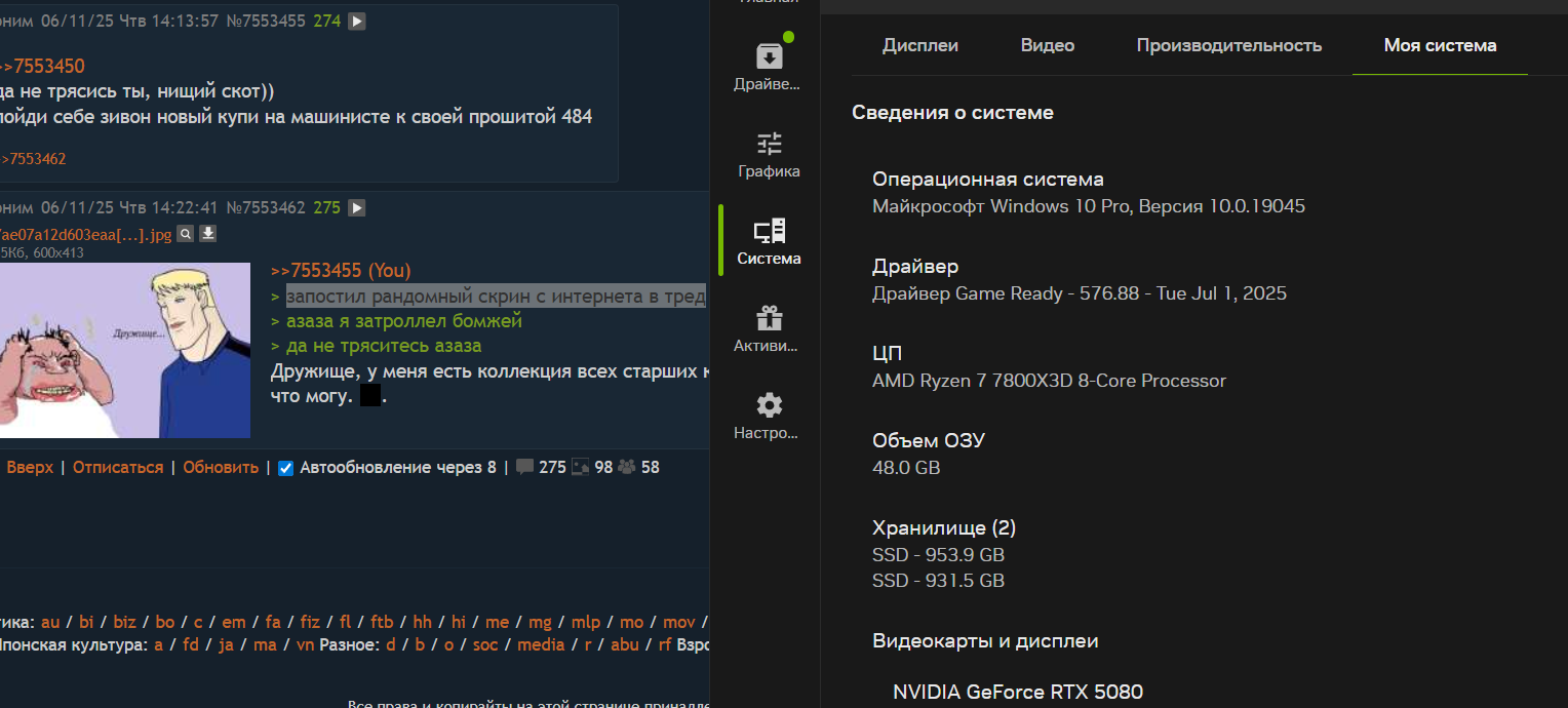 >>7548172 >Это как я понимаю свидетели гиперпня? Так гиперпень до сих пор еще может. Стоит 300р, имеет встройку под п106-100 и выдает 60 средних фпс в бенче киберпука. А секрет прост, ютубные протыки, реферальщики "ссылка в описании" тестируют игры на максималках с топовыми видюхами на максималках. Но в реальности мало у кого будет 5080\4090, а на обосраной рыксе из под майнинга не зазорно и настрйоки понизить.