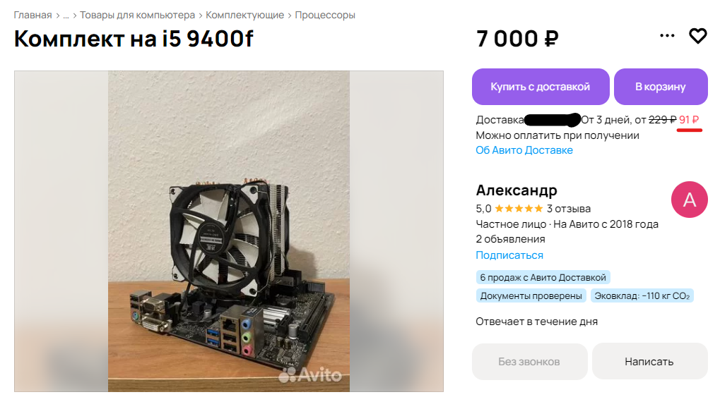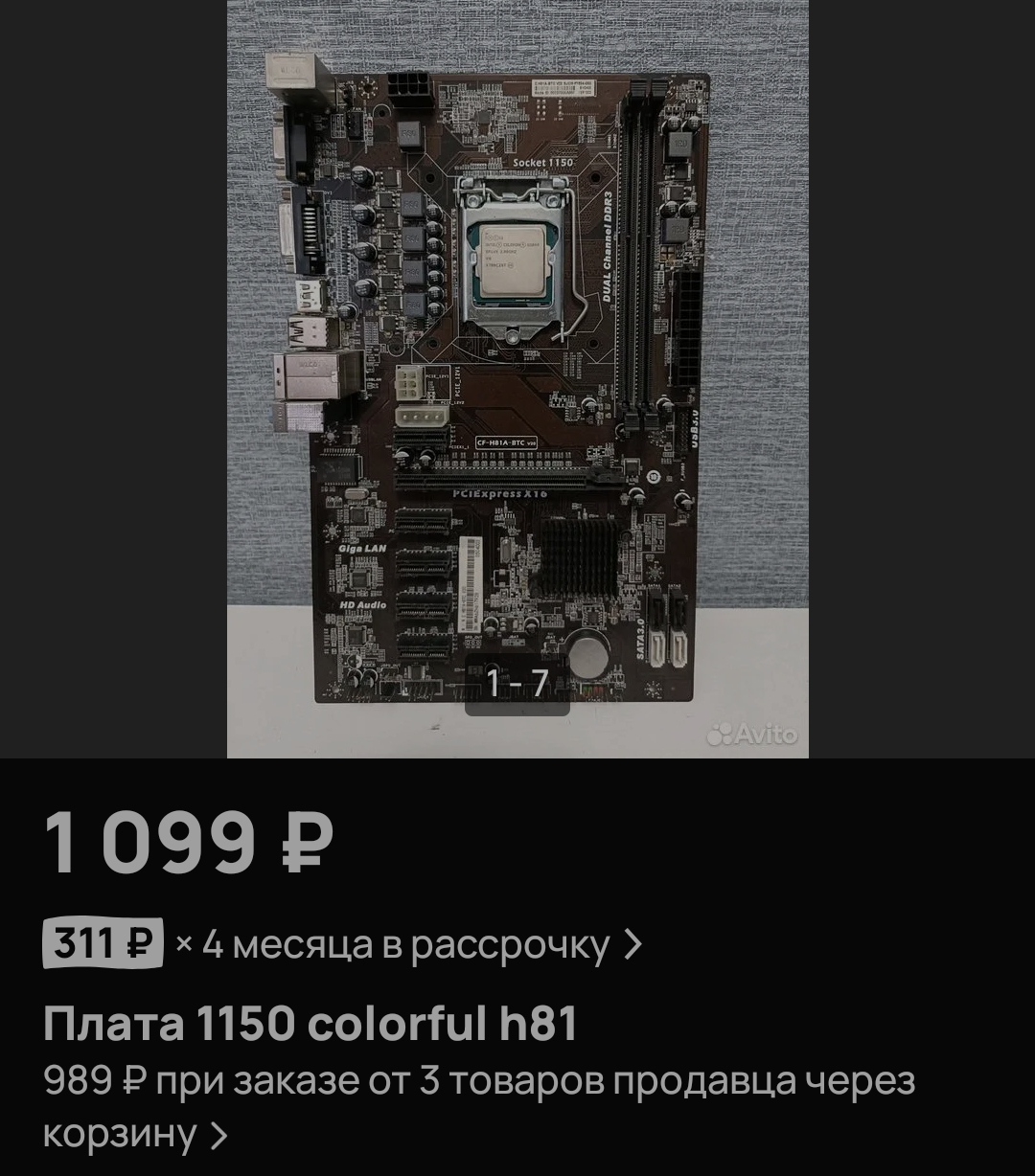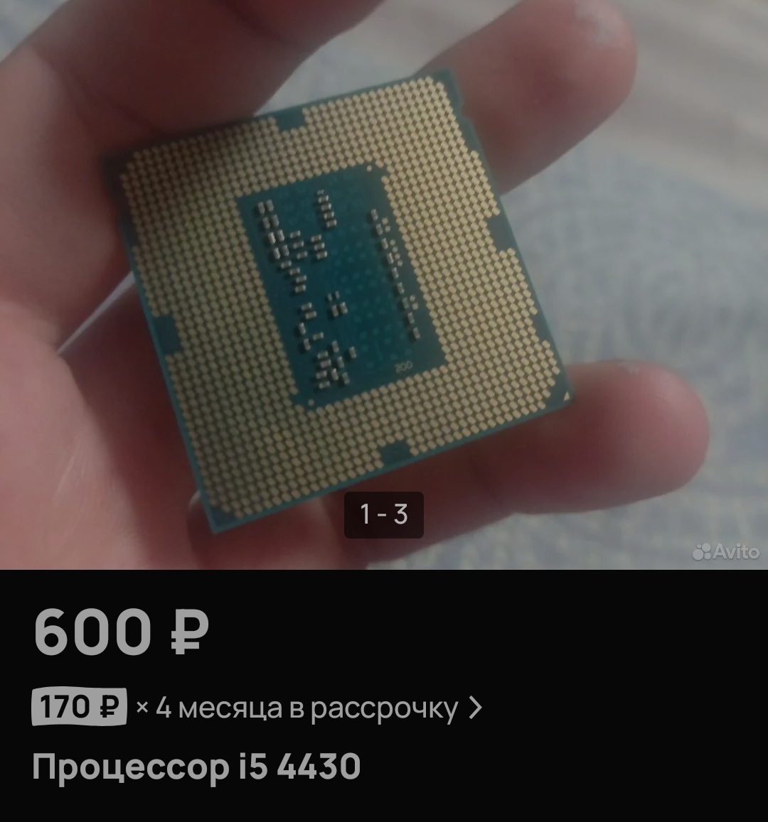 Эпопею с 1200 сокетом можно закрывать, распродал почти все, остался только селерон и -2000р убытка. Для тех, кто не в курсе, или забыл. Увидел на озоне материнку б560м лга1200 за 1650р, ну и желание пощупать железо новее 1151 уже было не остановить. Купил 10400ф по низу рынка, у барыги с 30 отзывами, в последних был 1 хуевый отзыв, какой-то юсб провод от зарядки не понравился покупателю, ну явно же не повод не верить барыге. Пришел проц, но ничего не работает. Хуево, что и в материнке не уверен, отзывы разные на нее, то видеокарта у кого-то не работала, а у меня проц без встройки. Купил еще калплект на н410+селерон, что бы навярняка, материнку с селероном проверить, а ай5 на другой материнке. Проц труп. А б560м в принципе норм, видеокарта не работала у челиков т.к. в биосе вырезан режим цсм, нужна видеокарта с уефи. Скинул материнки, проц выставил за 500р как брелок, и тут началось, за пол дня написало 4 человека, один халявщик, пытался узнать, может это я долбоеб в компах не понимаю, а он купит рабочий проц за 500р, 1 нейтрал, наебщик в отзывах кому-то сломанный электро самокат продал, наебщик2 продавец палёных процессов, он и заказал в итоге. Ну вот держите пикрил, 100+отзывлв 4.7рейтинг, уже продал мой ай5 по низу рынка. Я кстати написал отзыв тому гандону с 30 отзывами, у него рейтинг и не просел, а с того момента он уже 4мя 5ками перекрыл. Всем желающим собраться на хайповых сокетах, покупая проц с авито, желаю удачи.