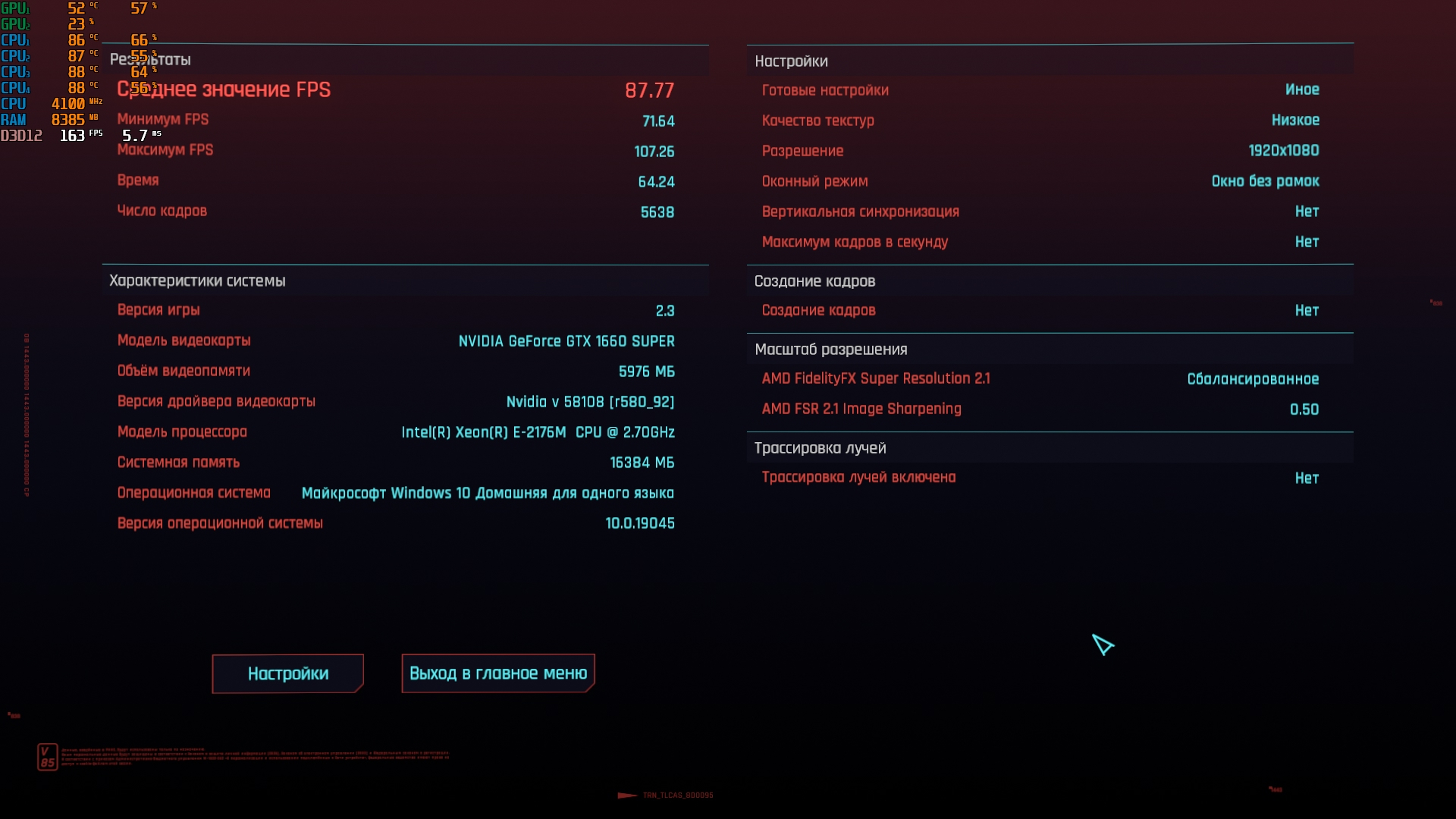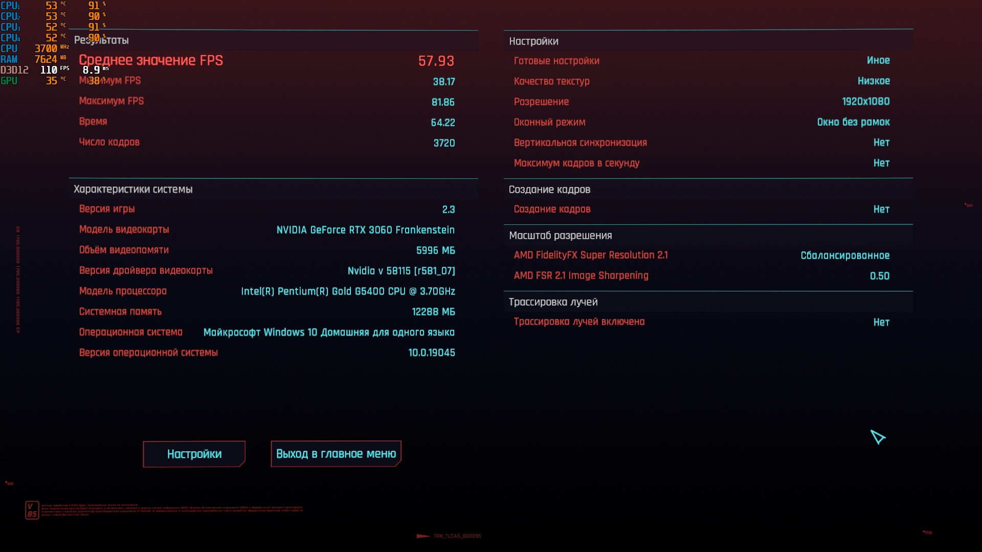 Бомж-бенчмарк-тред. Для понимания, на что сборки способны на практике, собираем результаты в бенчмарке киберпанка 2077. Игру качаем с рутрекера, портабл(148.8гб), настройки минимальные с изменением фср2.1 на баланс. Например благодаря этому тесту, видно, что производительность рыкса+4\8 = 4\4+п106-100, профита от 4\8 нет, т.к. упор идет в карту, но при этом сборка с п106 выходит дешевле.