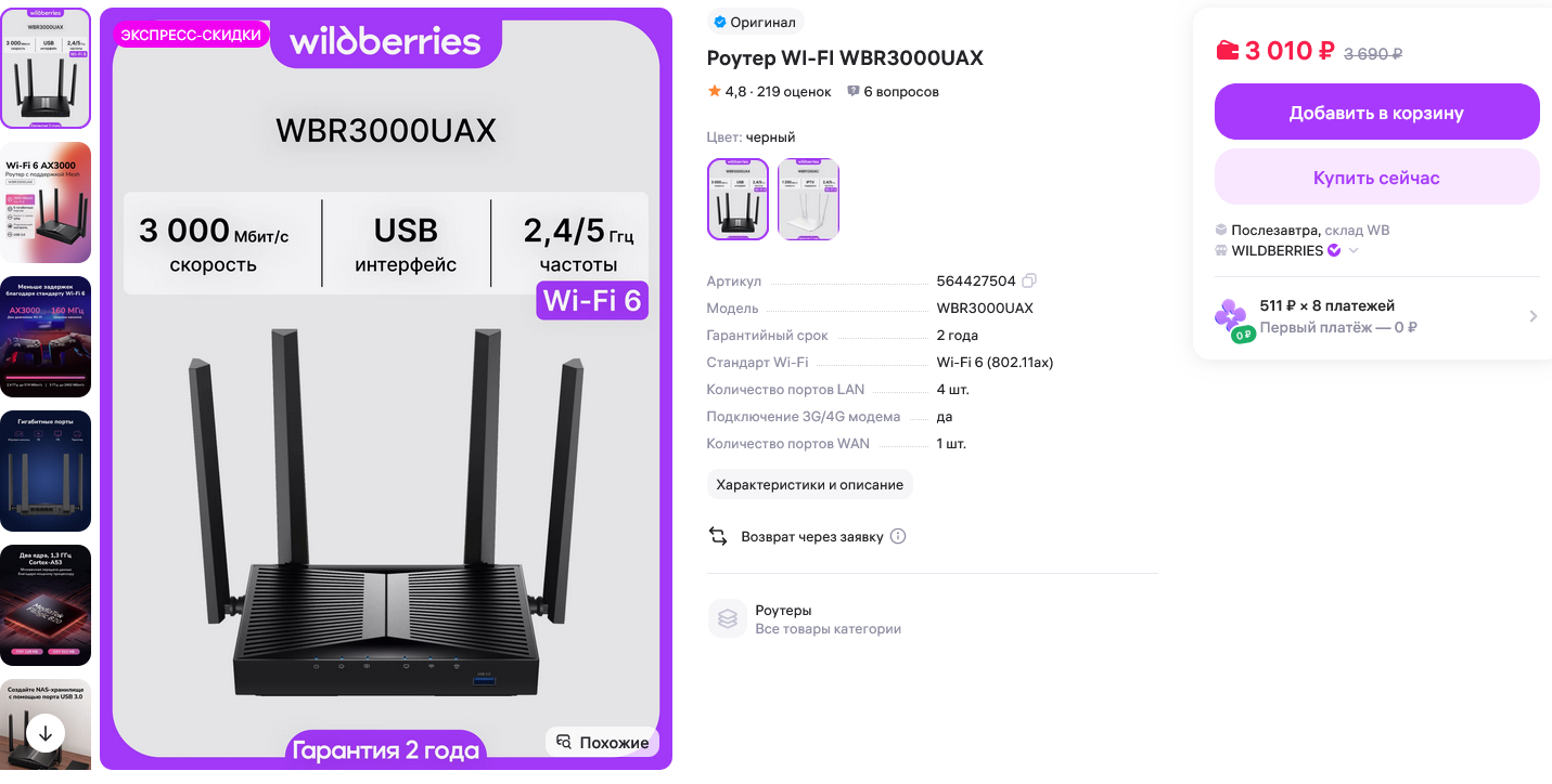 https://www.wildberries.ru/catalog/564427504/detail.aspx Топ кража? Похоже ОЕМ от Cudy спецом для Wb. Железо хорошее за эти деньги, шьётся и на ОВРТ и на КинОс. Какие подводные? Думал уже брать WR3000 с буквой, но они как бы на 2000 дороже и нет ЮСБ и один хуй пердолить прошивку. Есть еще сяоми AX3000T за 3900 в ДНС, судя по всему лежит давно в магазине в пердях, поэтому должна быть старая версия, которая шьется. Но там вроде сложнее с прошивкой. Тариф 200мб, если что.