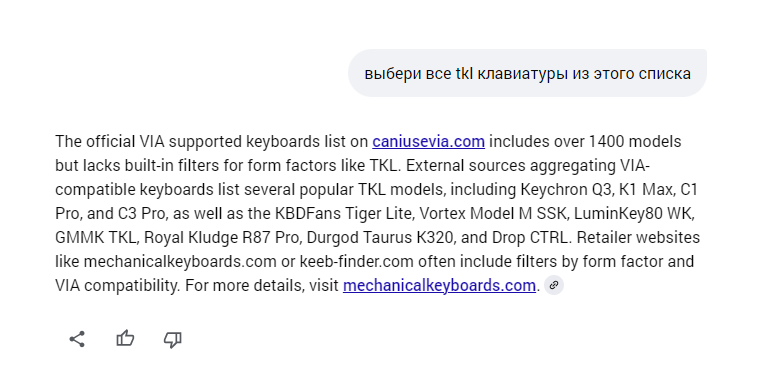 ананасы, кто из вас шарит в ИИ? можете загрузить этот список в какой нибудь сервис который смог бы составить список клавиатур, разбитый по вендору и по типу клавиатуры? https://caniusevia.com/docs/supported_keyboards