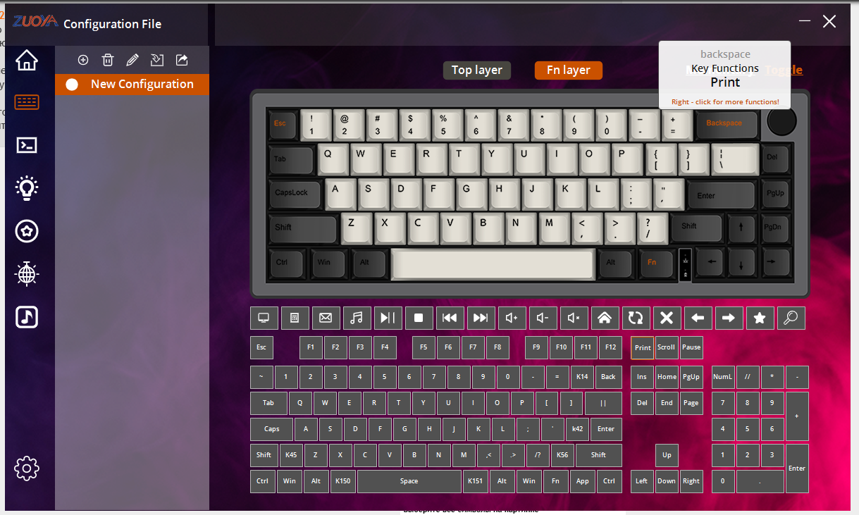 Скачал софт(пикрил). В нем вроде настроил чтобы была связка "фн"+"бекспейс" на принт. Но оно не работает. Подскажите, я уже два часа реддит листаю, про этот аспект никто не пишет
