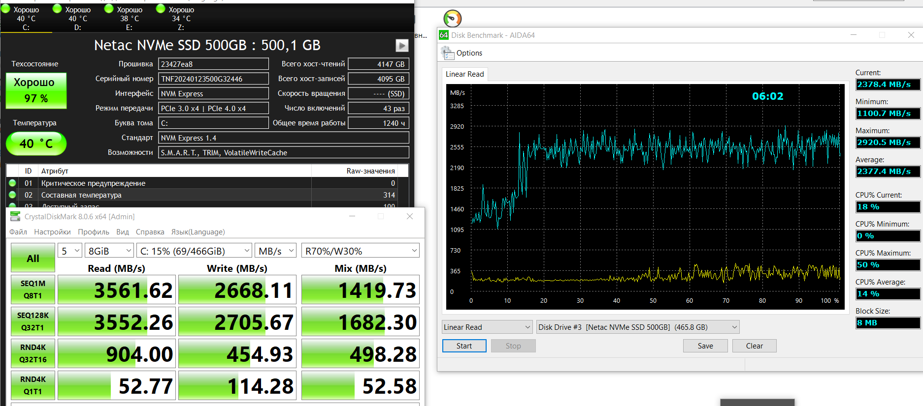 3. Пикрил - скорости в CDM. Если что, ссд подключен по Сата 2, не 3. Норм картина?