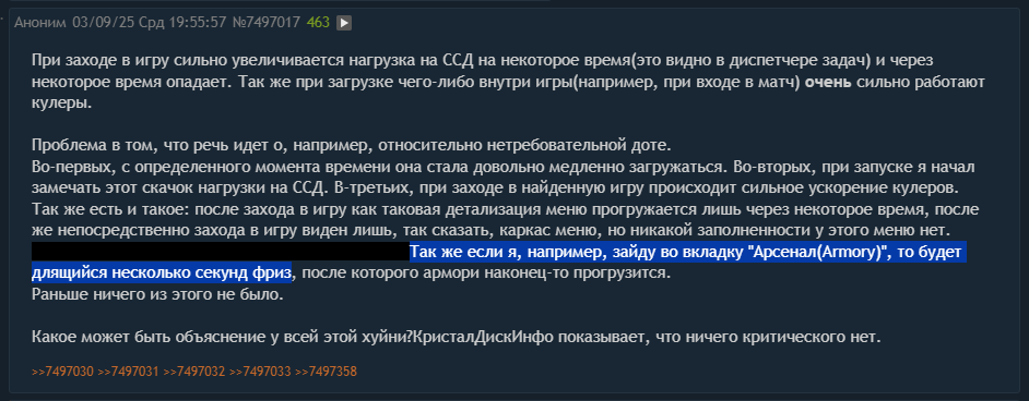 Блять я нищук и у меня тряска. У меня в компе один единственный ссд, и если он отъебнет то В С Ё. >>7599289 Безбуферники "фризят" только при длительной записи больших файлов, например при и после распаковки 50гб архива. Причем это даже не фриз, а скорее 10-30 секунд лагов, потом слц кеш раздупляется и всё приходит в норму. В целом не так уж и страшна жизнь на безбуфернике. >старым добрым винчестером в контексте базы под винду Винда 10/11 на хдд это гроб кладбище пидор. Безбуферный сата ссд это минимум для нормальной работы шинды. Современная винда делает очень-очень много чтений и записи мелкоблочки даже в простое, а у хдд с ней... ну в общем пизда. Если безбуферный ссд лагает только при длительной записи, то на хдд винда лагает всегда.