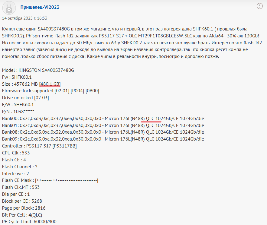 >>7552485 В общем Вадим Очкин сказал что здесь контроллер MAS1102 с чипами Samsung 3d-v8 236l. Хз что самсунг забыл в таком бюджетнике, видимо я в лотерею выиграл.