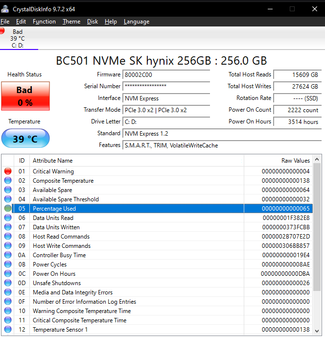 Смотри инфу в других программах умеющих читать смарт. АИДА64 или кристалдискинфо там.