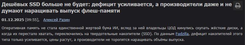 15700 кстати по нашим меркам не самая страшная переплата, у барена на амазоне 1тб версия 11200р, как раз надбавка наша классическая +20% к цене +параллельный импорт. тоже цены поднялись на ссд у них. хуй его знает бля, брать, не брать. с одной стороны, ну подешевеет он потом на 1-4к, ну побухчу 5 минут и забуду. а с другой стороны - пик, про оперативу так писали с пол года назад, но я как-то не обратил внимание.