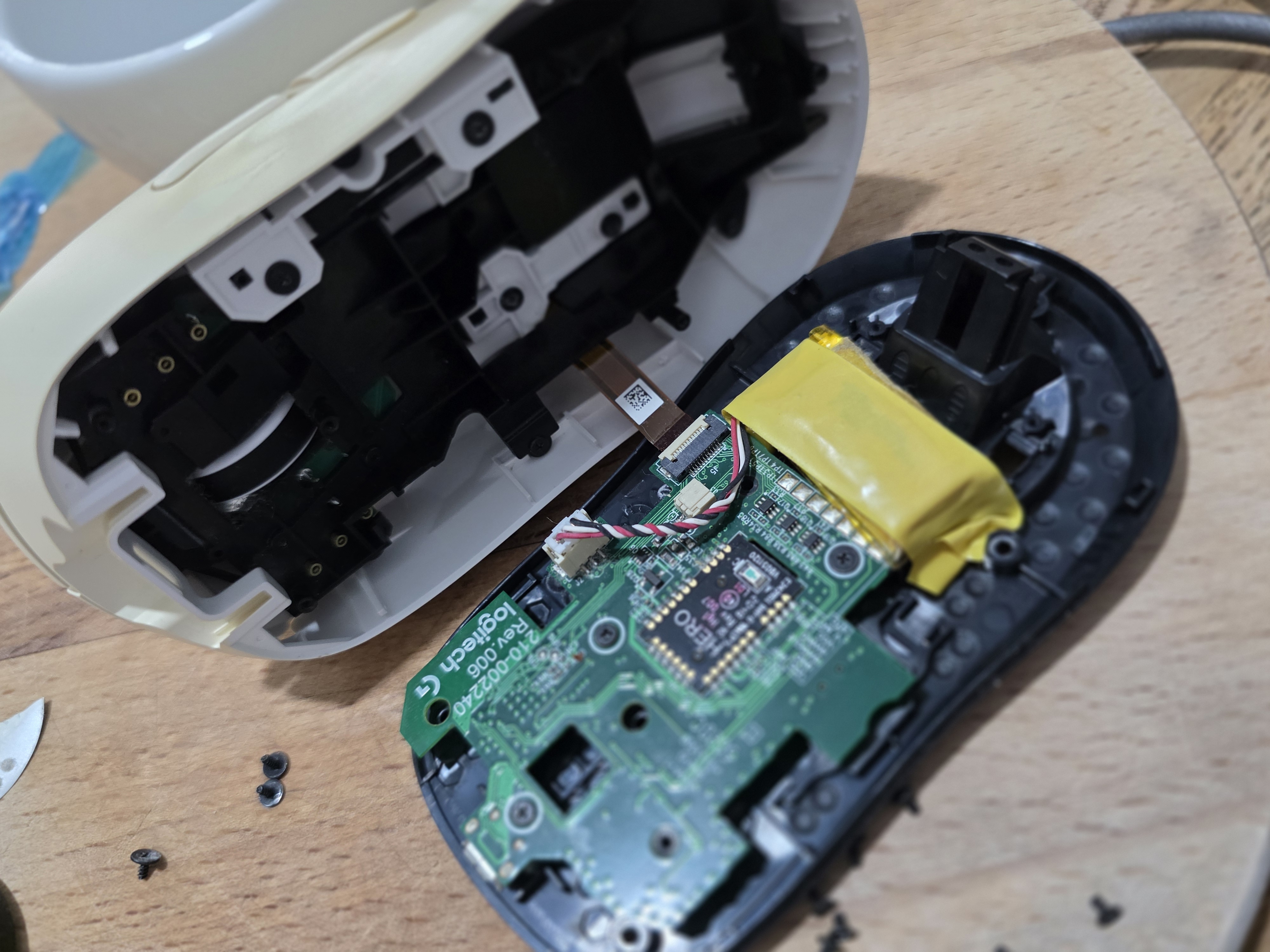 Пик2 — Логитек Суперлайт, эта желтая батарейка была присобачена к верхней части мыши на клей >клей в мыши за полторы сотни баксов, ага, и висела вниз головой. Это знают все, как и про механическое колесо у этого Суперлайта, которое лично у меня отлетело на третий год. Но я к тому, что НИЧЕГО НЕ МЕШАЛО закрепить батарейку по-человечески, на нижней плате, как я сделал желтой изолентой, на пикче. Нужно было только снять магнитики для нижней крышки, куда предполагается засовывать USB-ресивер беспроводной связи и на эту крышку его закрывать, когда мышь в походном положении.