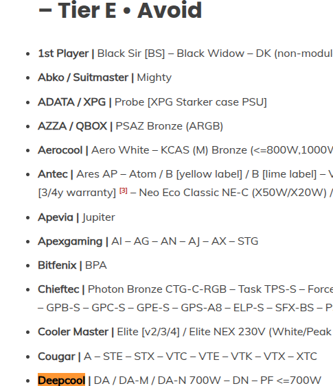 >>7563197 кстати да, есть один сайт тирлист бп, он конечно не обновлялся с 23 года, но все же твой дипкул там в тир Е, а вообще грубо говоря можно брать тир А и В, на крайняк С, золотым и синим текстом лучшие модели тира как я понял, синий<золотой сайт хоть и не обновляется но как будто все равно неплохо когда ты вообще не разбираешься в блоках питания, а хуевая модель может быть и у хорошего производителя типа тот же монтеч или чифтек
