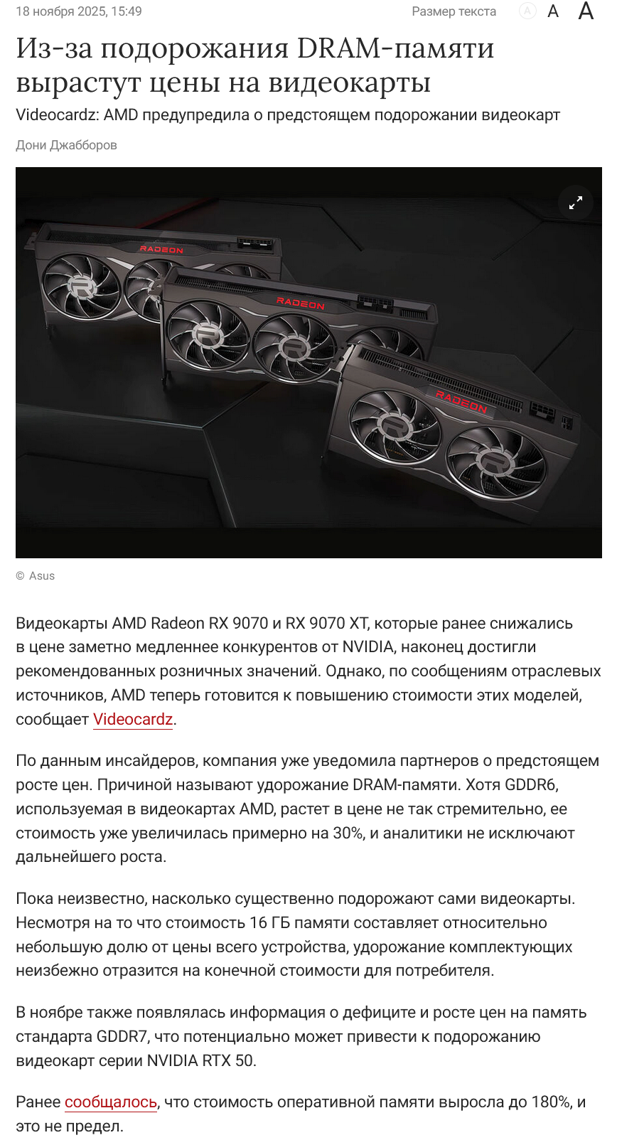 >>7573153 Это не только печка на 300 Вт, пережившая не одну волну майнинга, на неё ещё и дрова новые перестали выпускать. И что она даст в особо требовательных играх без быстрой подсистемы памяти, которая сейчас на вес золота ? Конечно гораздо разумнее купить 9060 XT или 5060 пока они ещё не закончились по доступным ценам. А потом если повезёт до сентября обновить остальное.