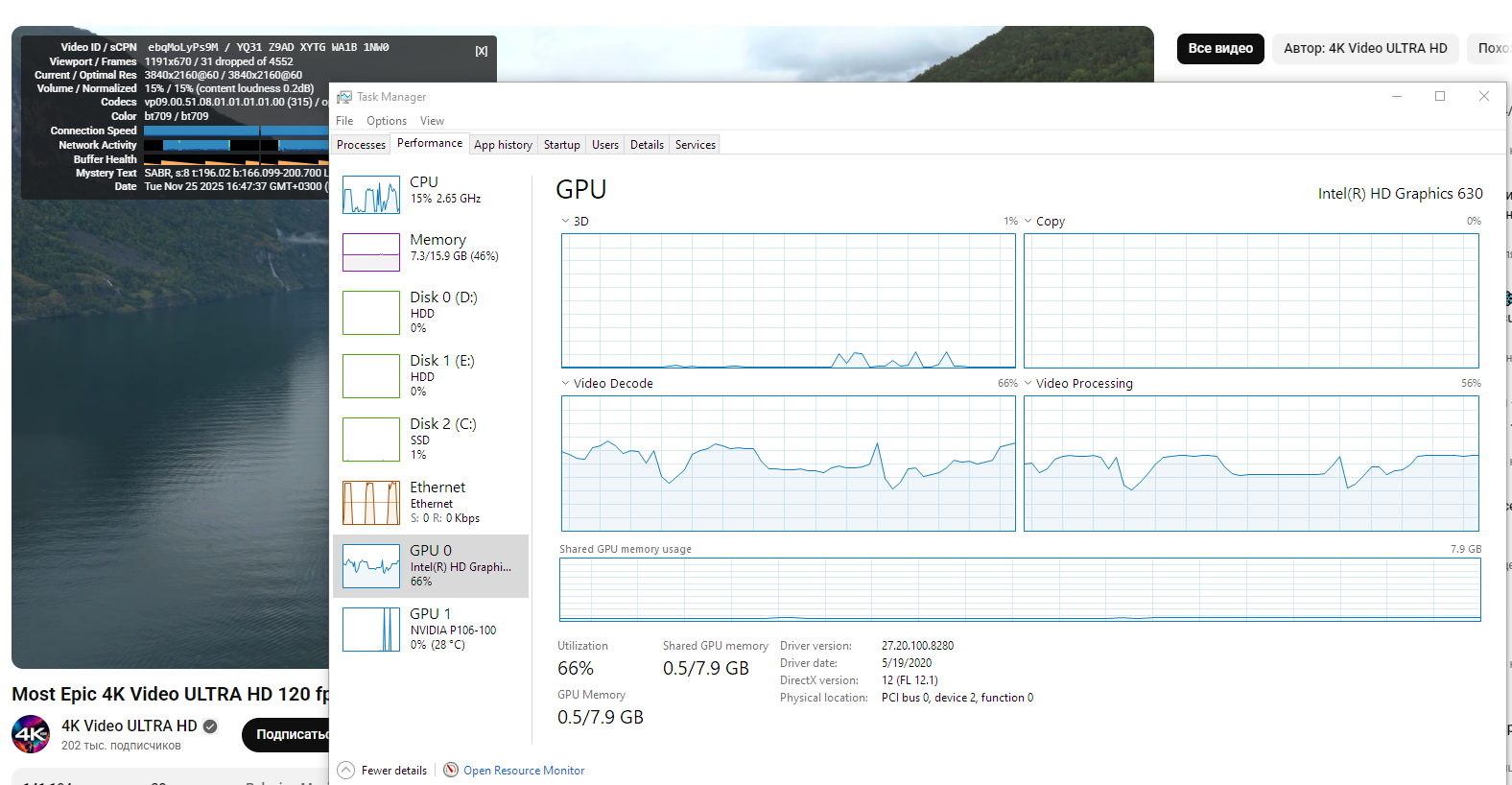 >>7572881 >RTX 5060 >Порадовала аппаратная поддержка современных кодеков. Оказывается ютуб подтормаживал не из-за скорости соединения и замедления серверов, а из-за старой видюхи. ох лол встройка i3 7100 при воспроизведении 4к ютубчика грузится где то на 60%, без дропа фреймов, и не мешая работать в остальной системе, онлайн fullhd видео грузит встройку процентов на 10% кек многие из вас не понимают что мы находимся буквально в эре конца технологий когда уже никуда не надо идти, мы и так дошли до края уже