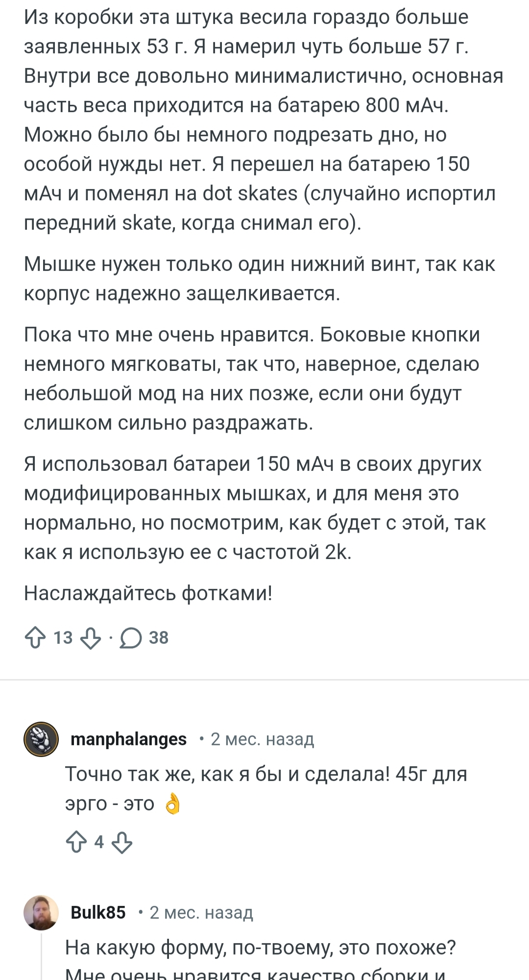 Взвесил на весах VT0, 49,5 грамм со стоковыми глайдами, которые не хуже мэджик айсов. Недурно и это при акуме в 800 и монолитном корпусе который вообще не трещит. Рапу прям радует, похуй что скажут лахта, поебать. Такая годнота за 3600, ахуеть.