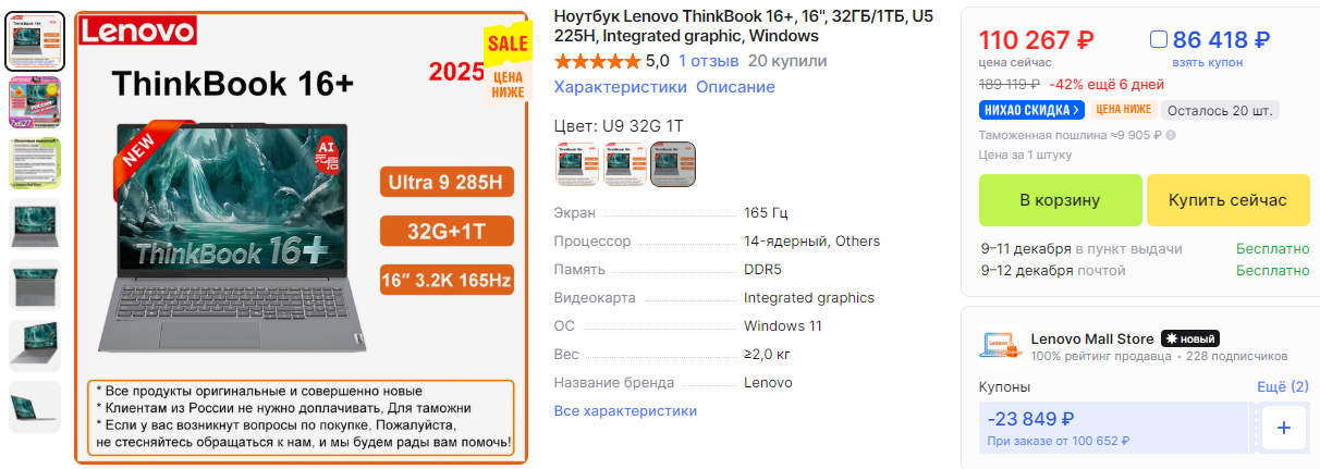 >>7577773 > Это Lenovo Thinkbook 16P c Китая, обошёлся в 99 тысяч рублей. Прислали СДЭКом. Где брал? Через посредников или сам оплачивал по алипей/другим способом? Скок сдэку и таможенный сбор отдал?