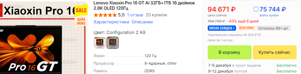 >>7576573 Это Lenovo Thinkbook 16P c Китая, обошёлся в 99 тысяч рублей. Прислали СДЭКом. Очень приятная шустрая машинка, классный экран 2К 240Гц, со всеми цветовыми профилями.