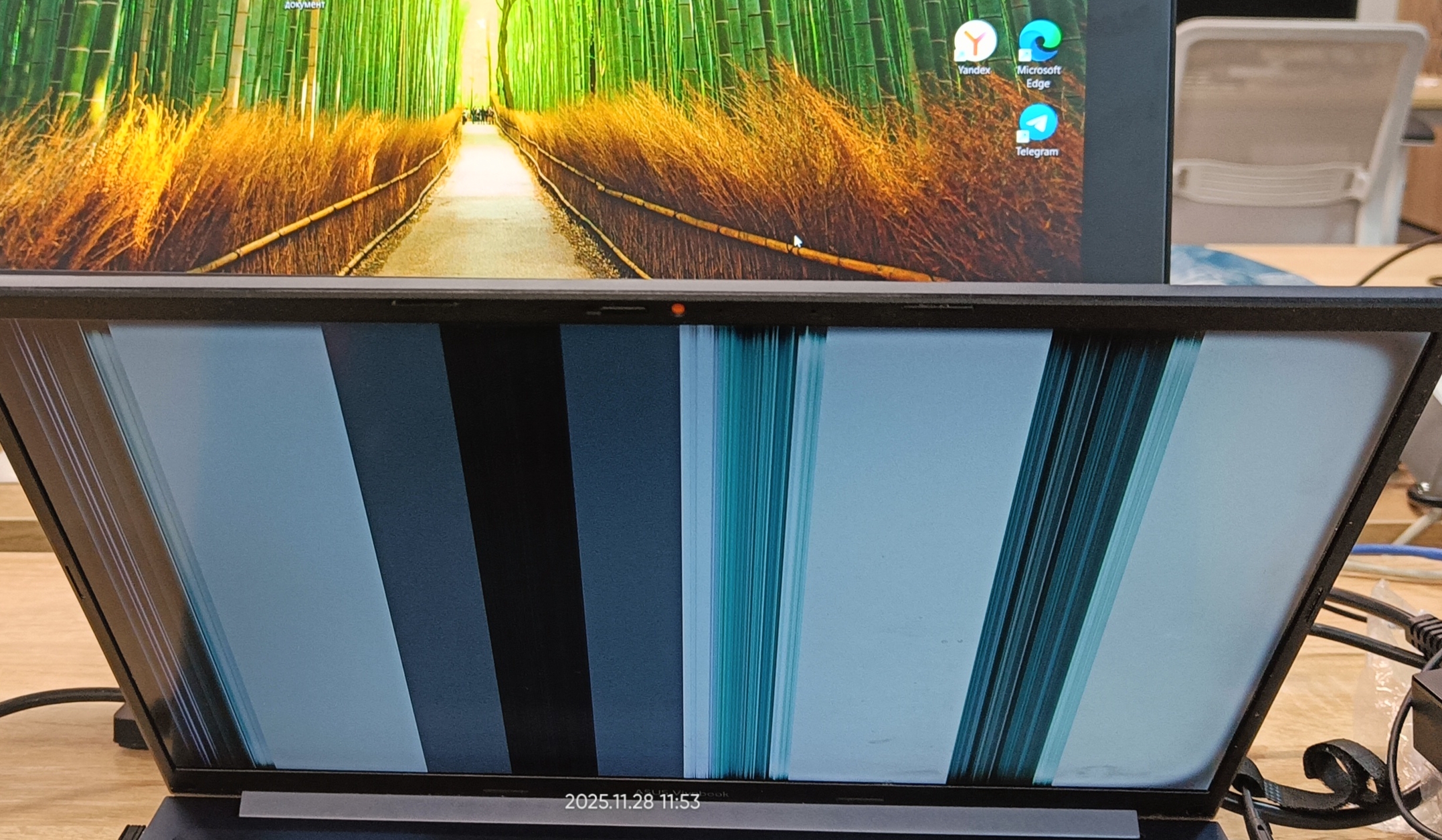 Кто нибудь может подсказать из за чего полосы ? Если двигать экран или надавить на него изображение полос не меняется. На монитор выводит изображение без полос. Появились полосы два месяца назад , сначала при включении винды одна белая полоса я на месте большой черной (на фотках), потом не появлялась долго, затем через недели две во время пользования ноутбуком появились полосы , которые пропадали только после охлаждения ноутбука на улице в -5 на минут 20 . Сейчас , после таких махинаций, уже вроде даже охлаждение не помогает. 5 фото , потому что в течении дня полосы менялись сами по себе