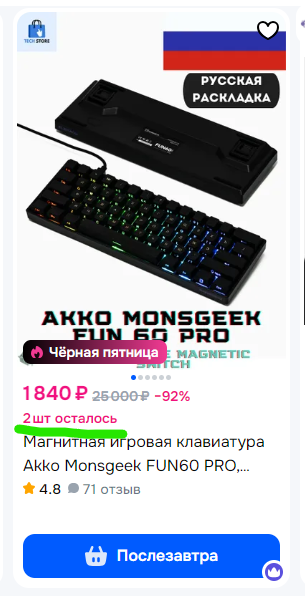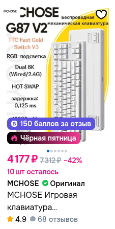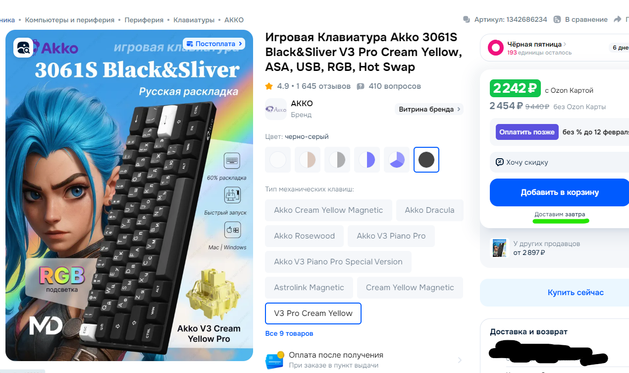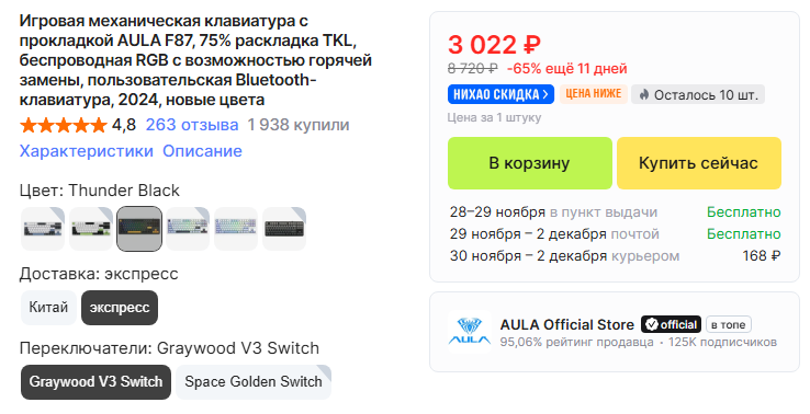 Хотел такую купить, но слава богу передумал, а то было бы две клавиатуры. Тут вторые ЧОКИ. Кейкапы на низкий профиль супер дорогие. Я, кстати, свой корн купил за 3500 где-то: 4100 - 600 р кэшбека.