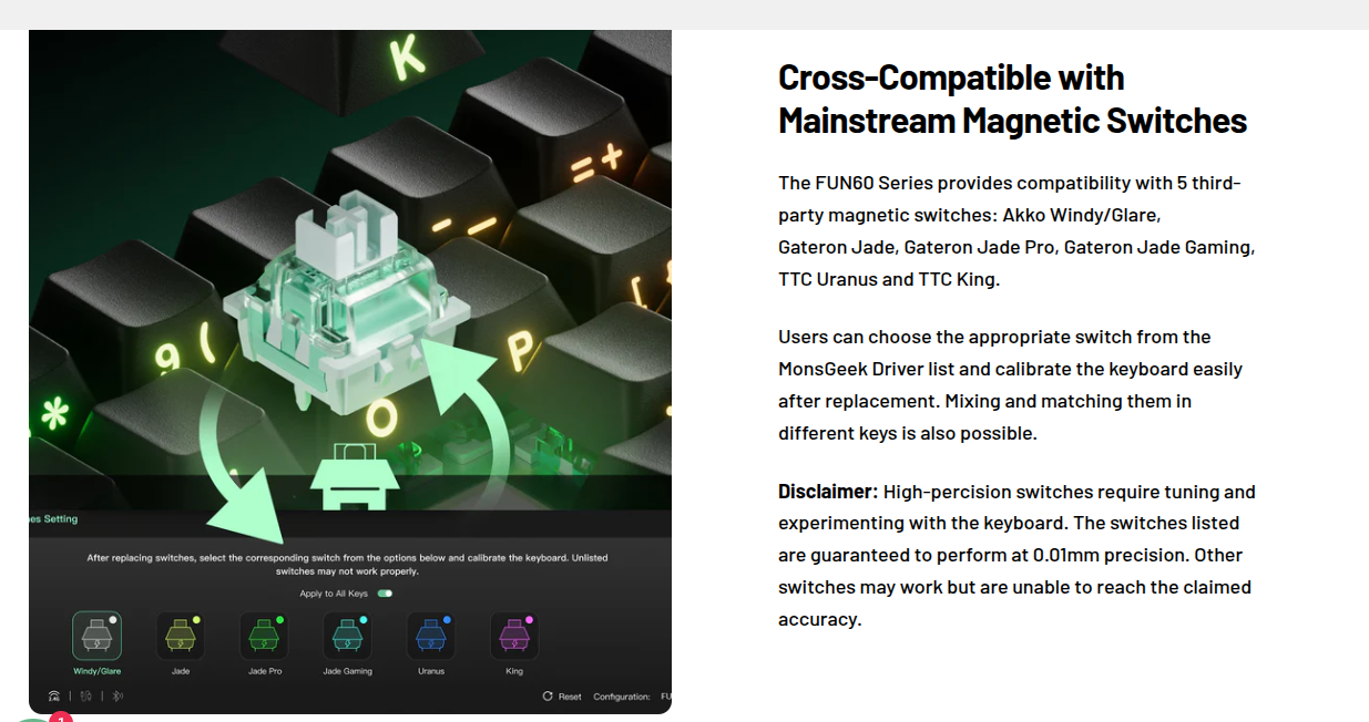 А с HE магнитными клавами вообще ничего не понятно, там же фактор калибровки под расстояние между датчиком и магнитом критично. Это вероятно может означать, что клавы не hot-swap Иначе если я вставлю тихие HE свитчи, с иным расстоянием до магнита, как будет работать настройка порогов в софте, который не знает что я изменил физические параметры системы. Не понятно что вообще искать, даже GPT говно галлюцинирующее наваливает мне