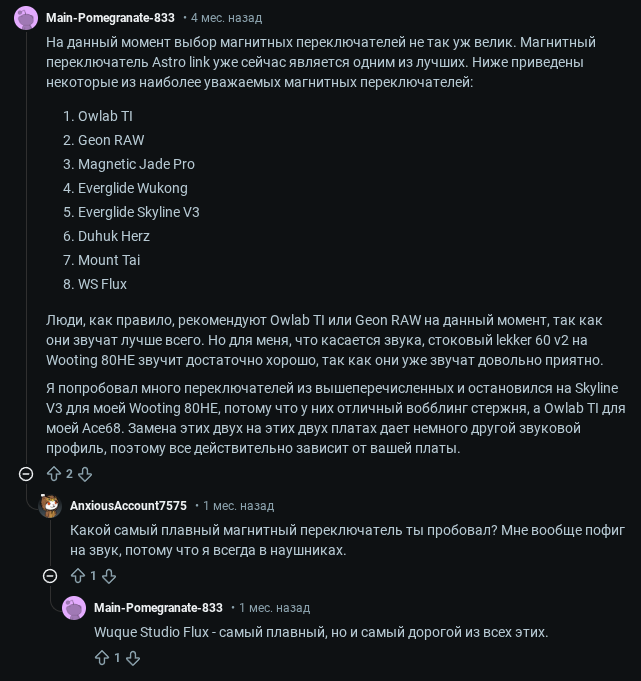 А тут появились магнитные, которые можно еще откалибровать под себя, что есть имба, но фактор беззвучности по прежнему важен. Но даже их делают с искусственным клацаньем. Воздержусь от оценочного комментария по этому поводу.