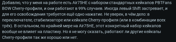 Клаваны, какая на 2025 год по профилю кепок мета? Самый удобный и эргономичный для печати профиль какой? Я пока остановился на модифицированных MDA (толстый моно PBT с сублимированной печатью, вот прям этот, с котанами) со снятой "фаской" (нет отсрых граней) на ISO-раскладке (TKL), выемка сферическая средняя, скульптирование базовых рядов, наиболее комфортно в плане усталости и количества ошибок печатать. Я много печатаю, в игры не играю. OEM мне никогда особо не нравились, Cherry пробовал, но как-то низковато и плосковато, CSA с глубокой выемкой использовал пару месяцев, вроде почти норм, но всё же высоковато, накапливается усталость немного быстрее.